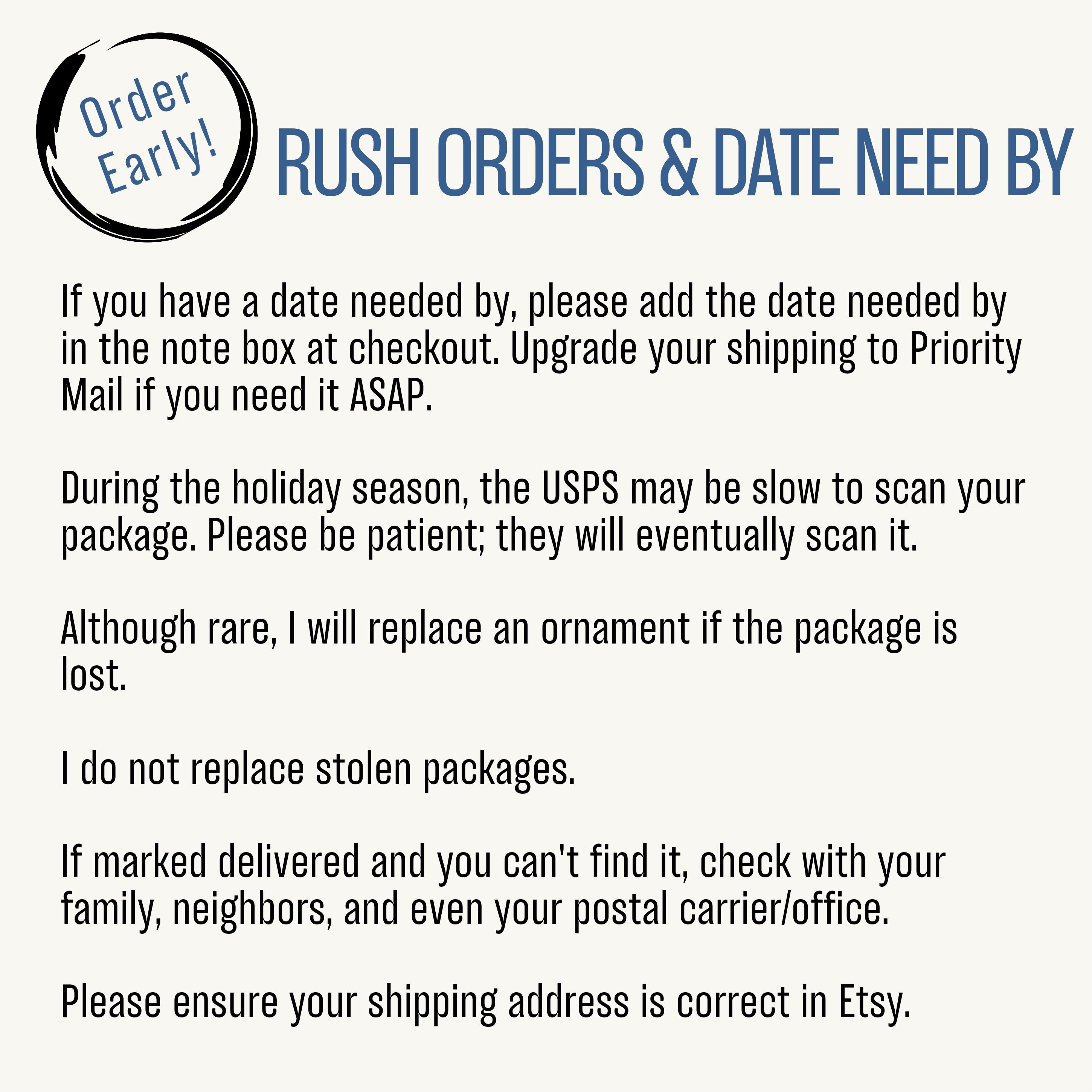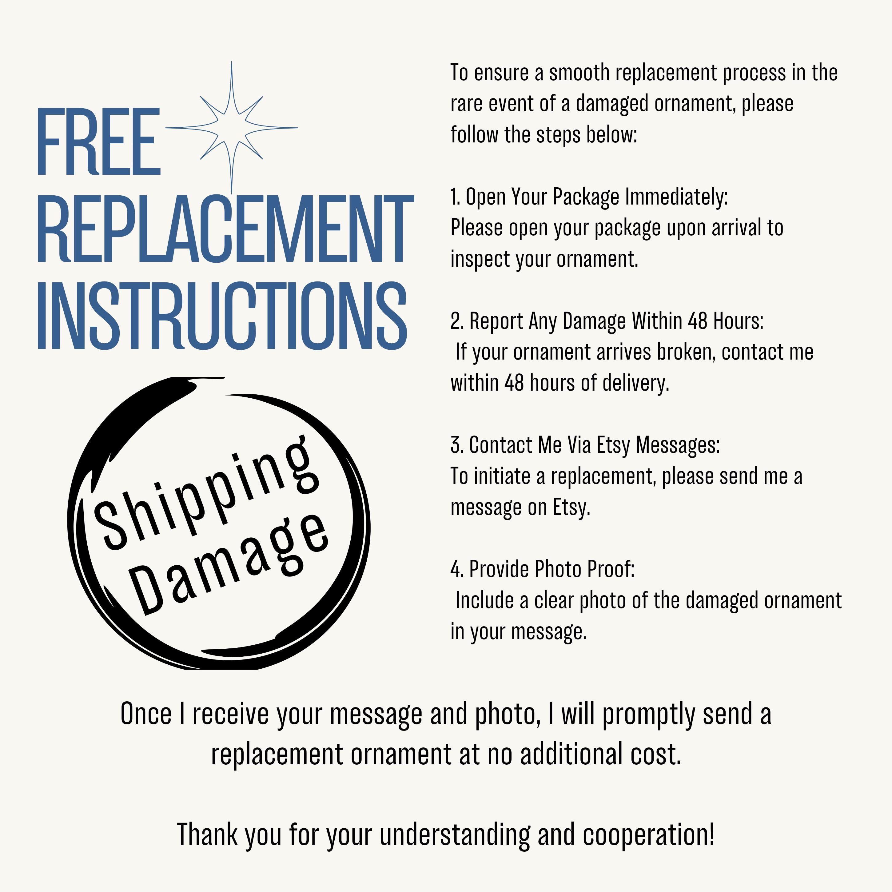 If your ornament breaks in shipping please let me know within 48hours of delivery and I will replace it. Just send me a message with a photo. After 48hours I cannot replace ornaments for free. I do not replace broken ornaments because of accidental drops or falls.