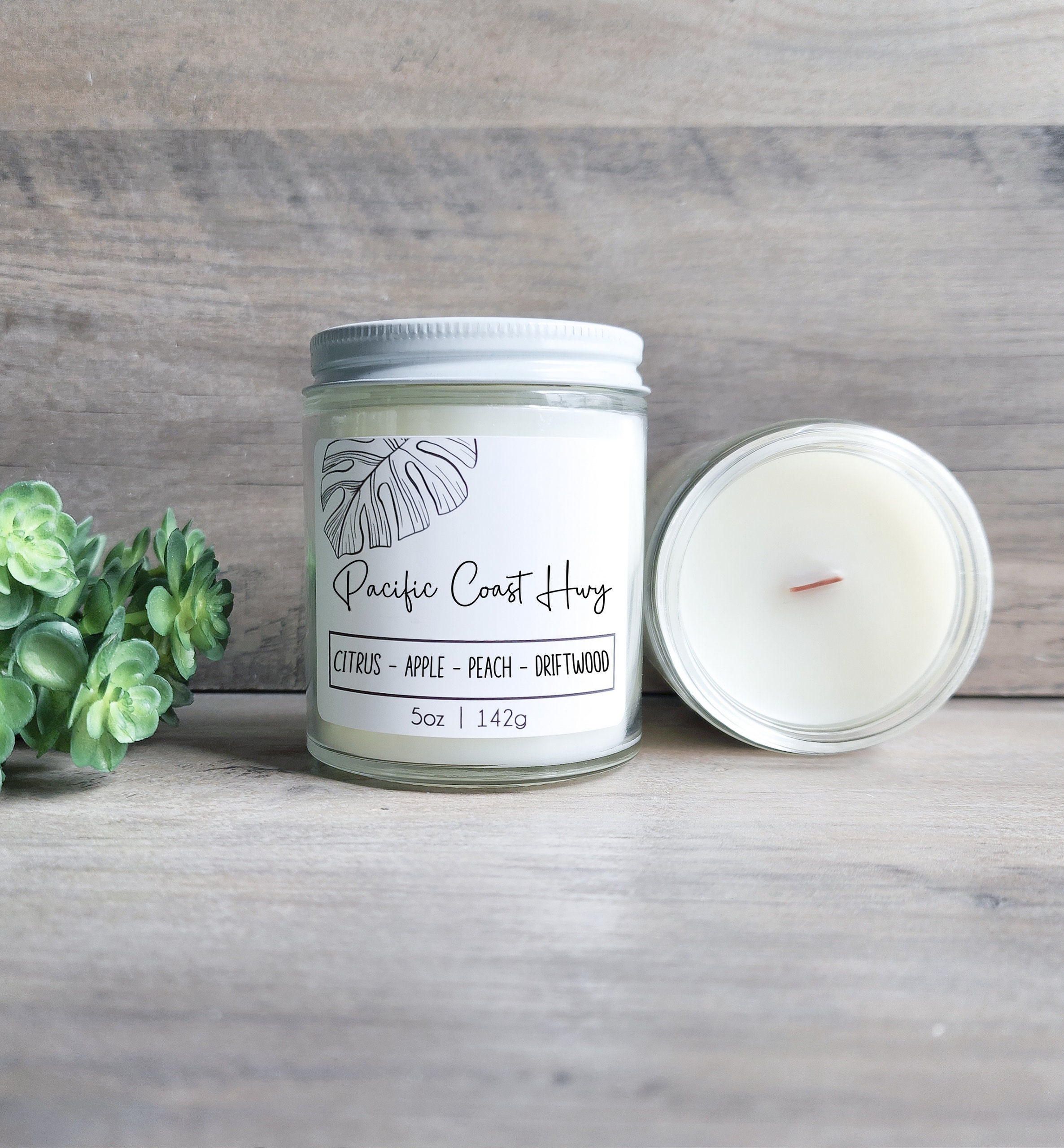 Our candles are custom blended scents that you can enjoy or give as a gift. If you love a fruity tropical beach scent you will love this candle. A minimalistic designed candle that will give you summer vibes. This soy blend wax candle has a crackling wood wick. Simple metal screw lid style jar can fit into any home décor. Give one as a gift or keep for yourself. This is the perfect jar to reuse after you burn your candle! Use in the bathroom, on a nightstand, or on a shelf in the living room for added texture and design.