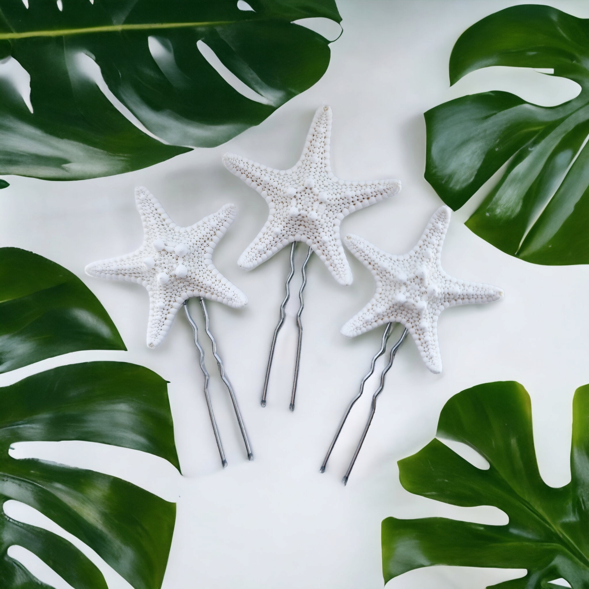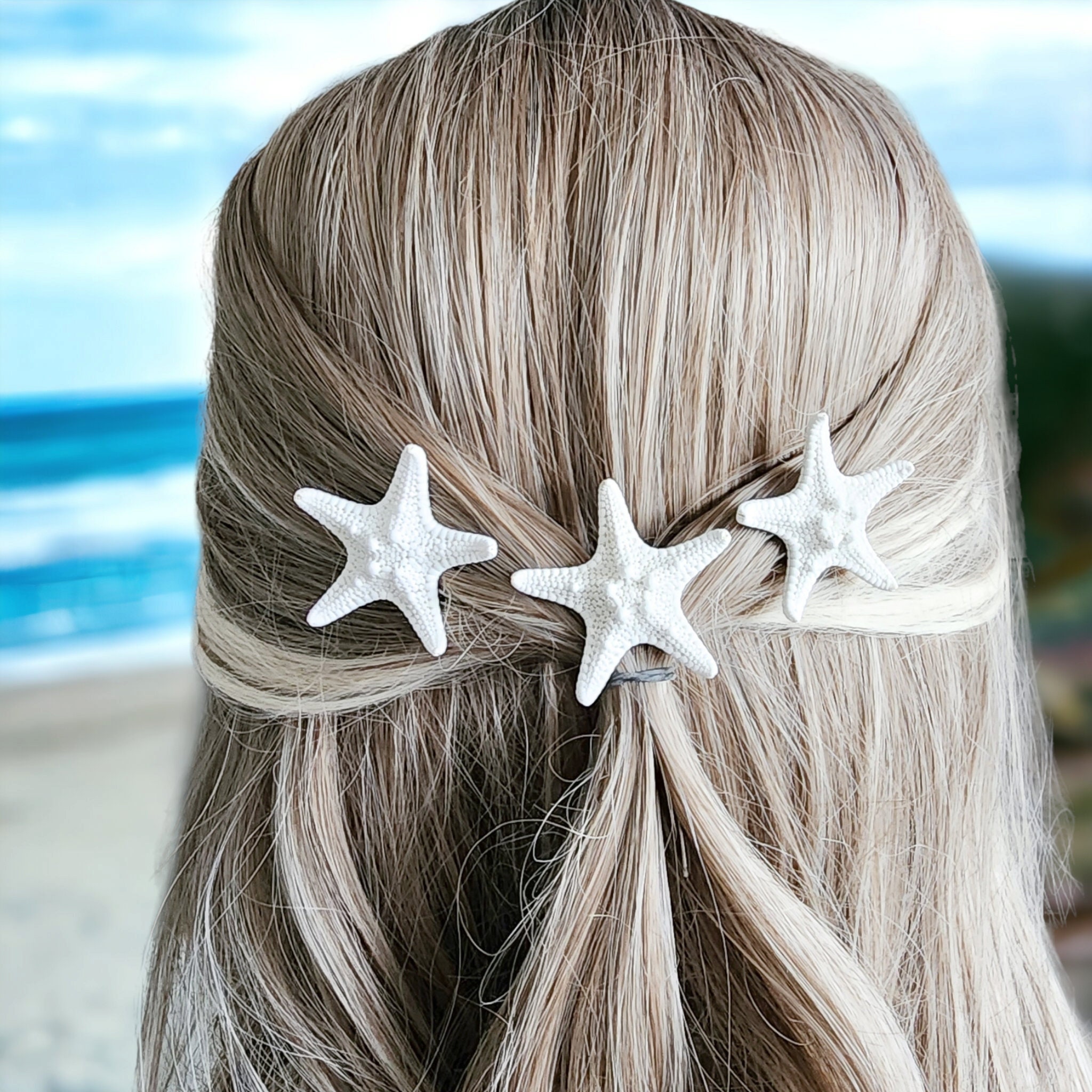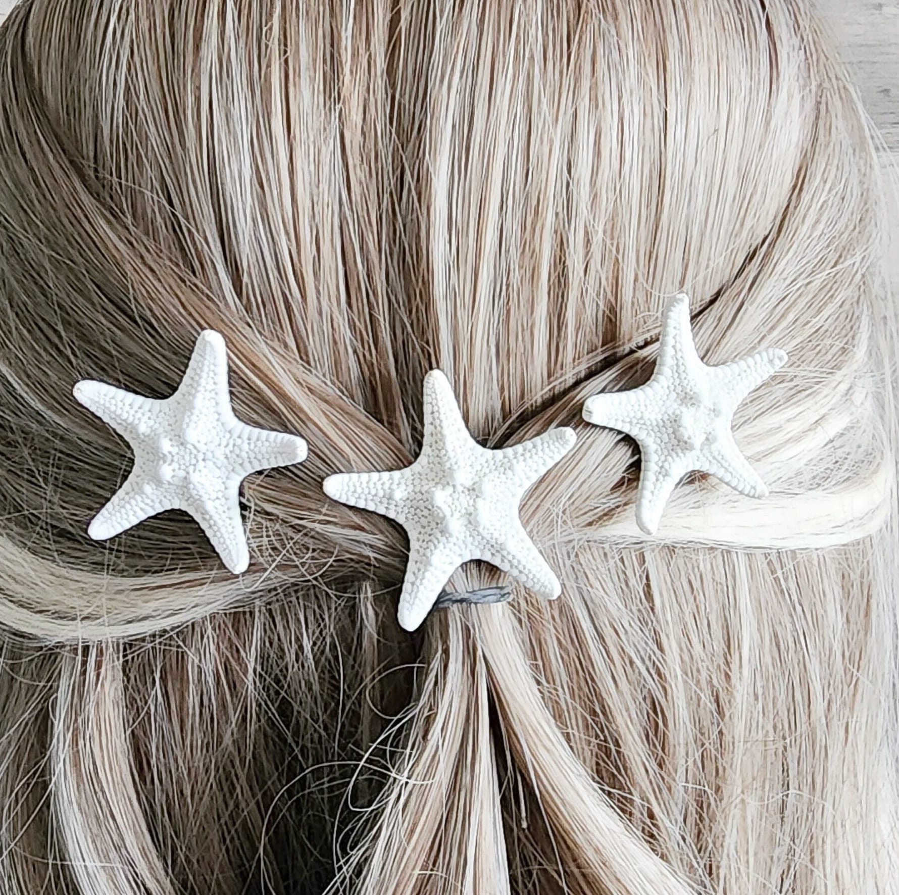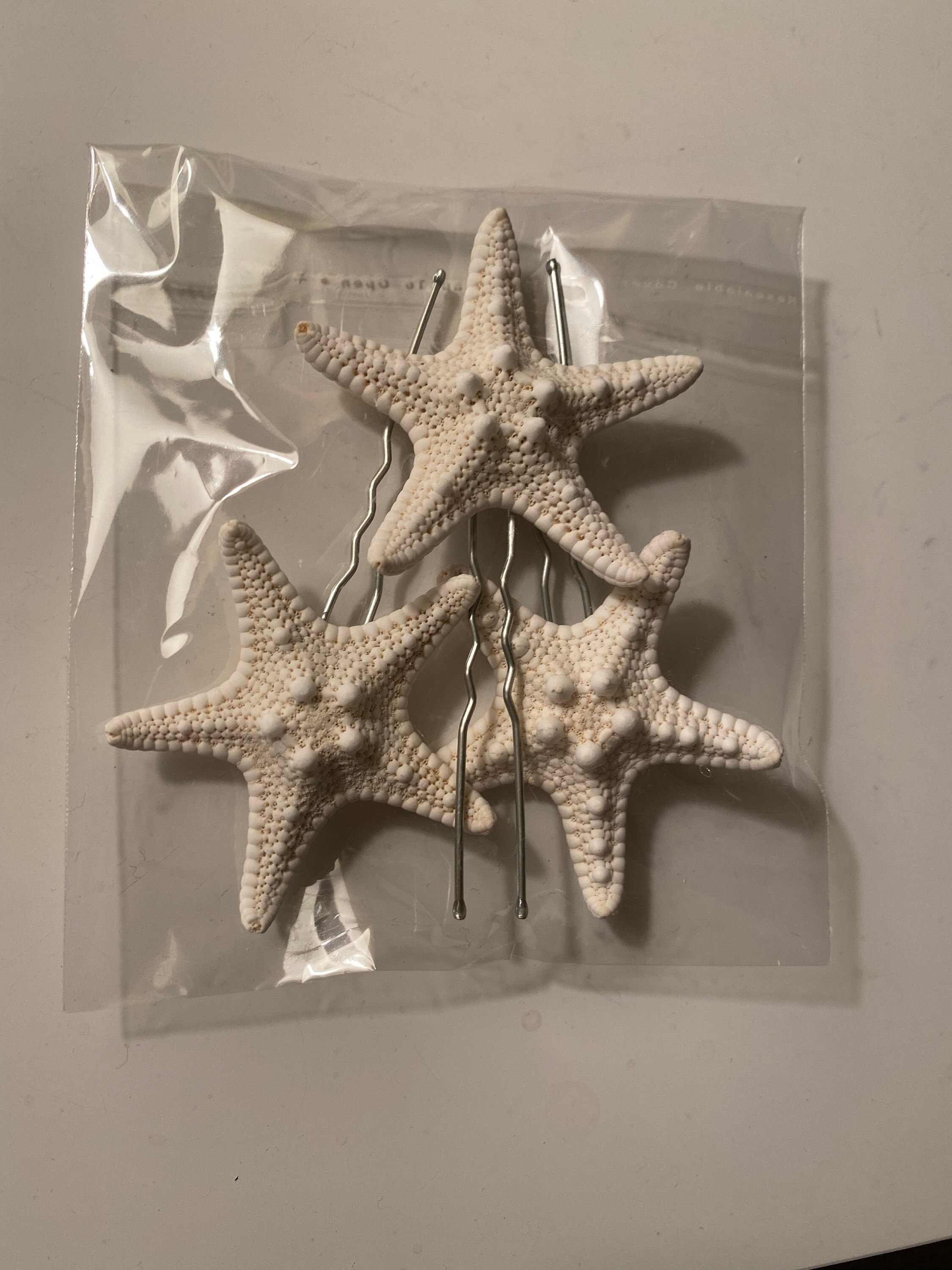 Our hair pins are the perfect accessory to place in a bun or braid. The are stiff but the metal can be gently bent. Wear for your beach wedding or to a party at the shore. Our starfish are bleached and have no bad smell. The backing is made with a light slip resistant adhesive to help hold in the hair. Use additional bobby pins as needed to secure your hair pins.