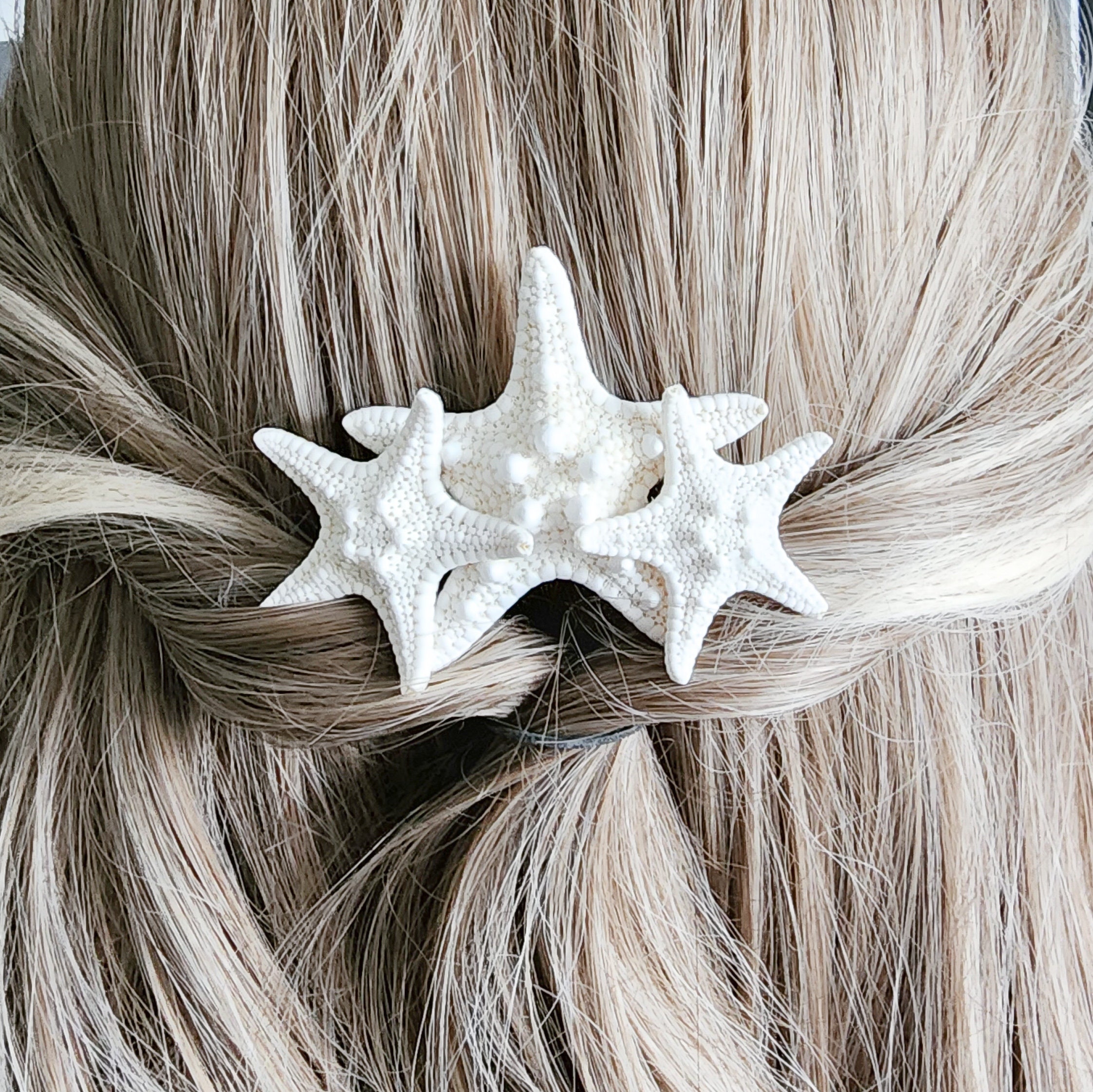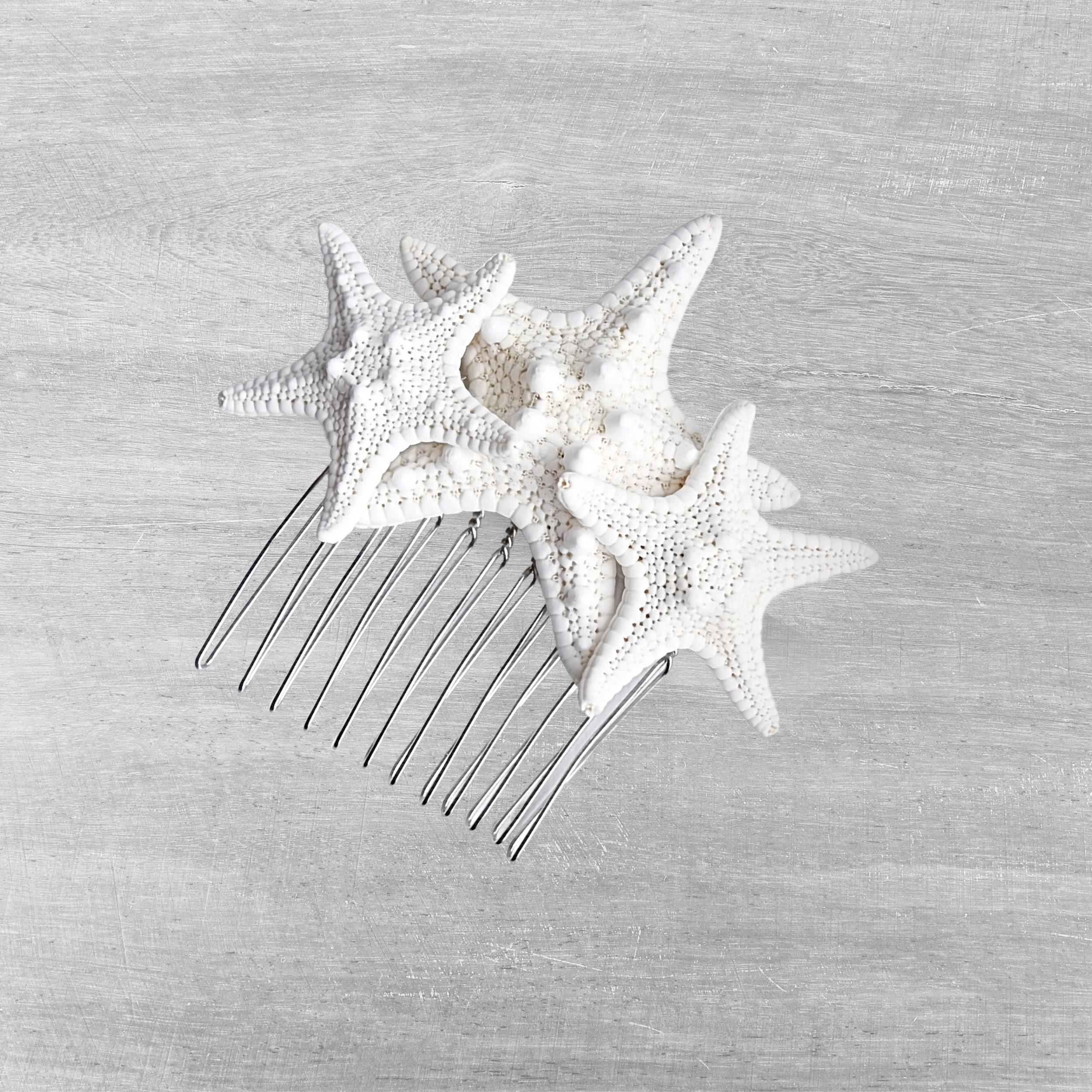 Our starfish hair combs are perfect for that simple updo at your beach wedding. The hair comb is great to use with bobby pins to hold in place. Each knobby starfish is perfectly placed and permanently secured to the hair comb. Store in a dry place.