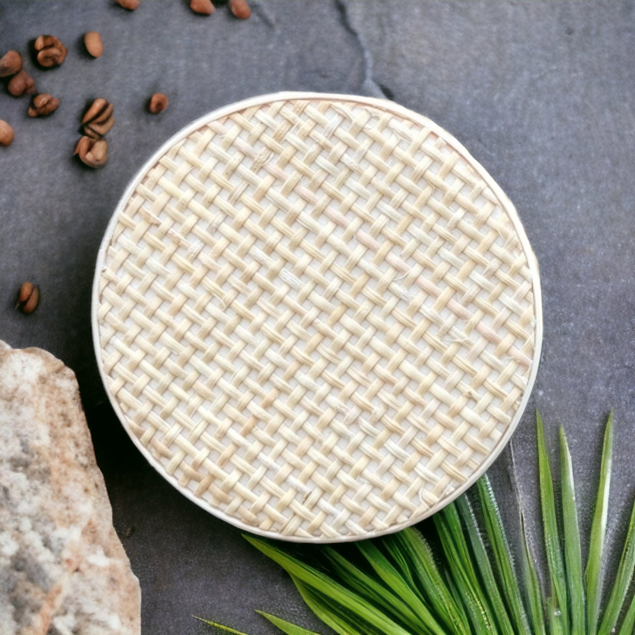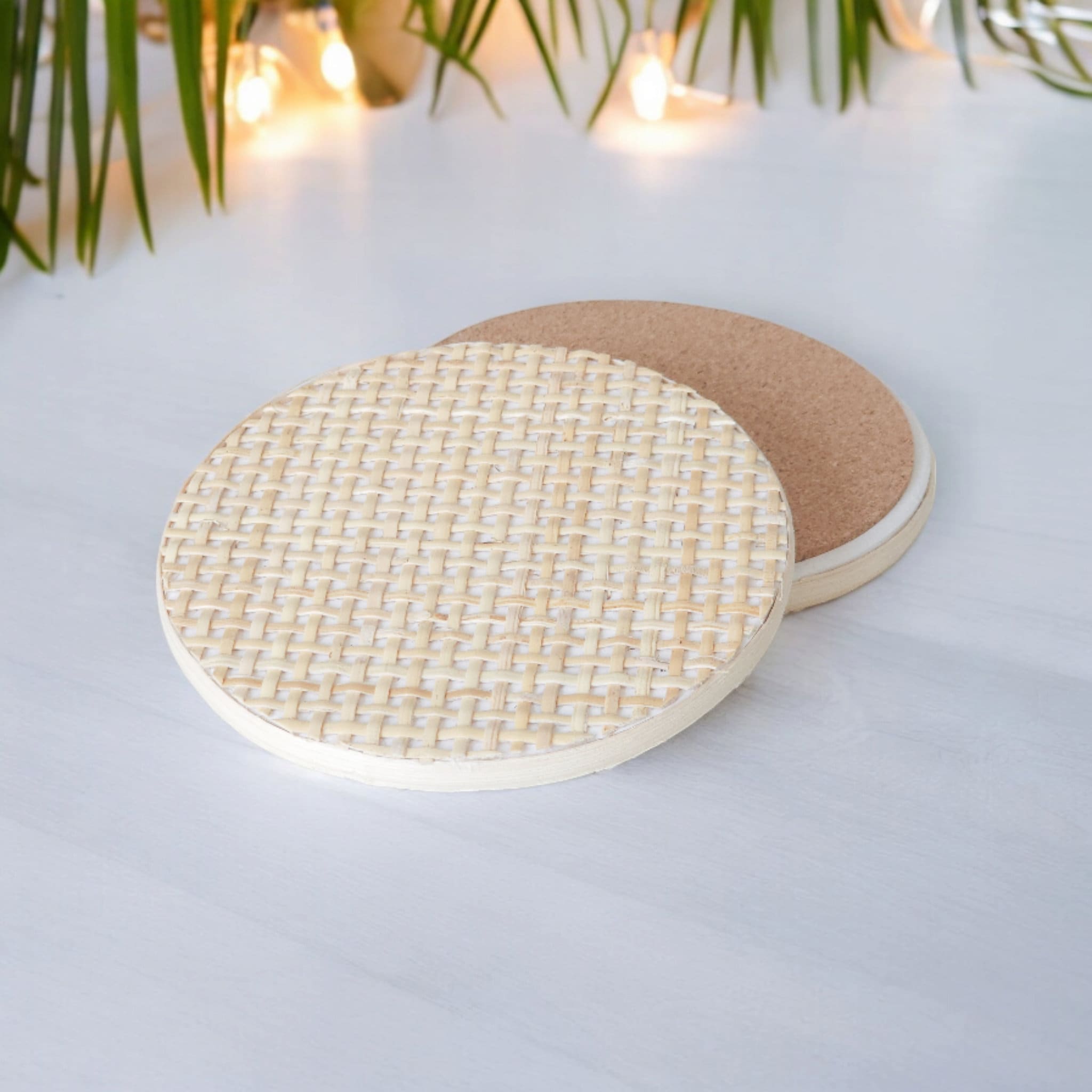 This set of coasters are the perfect addition to any beach coastal or mid century modern style home. The retro cane webbing is not only simplistic but gives texture to any home décor. The rattan style coaster is neutral and matches any home colors.