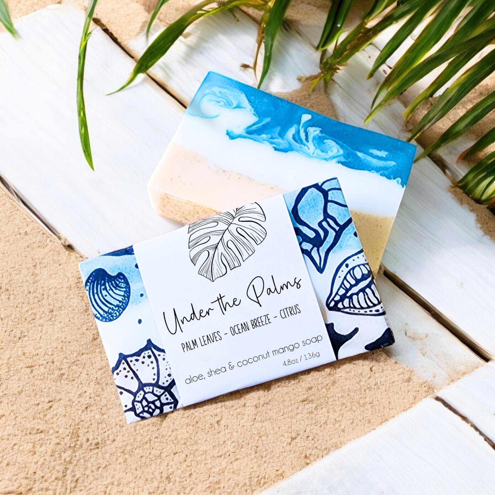 Hand crafted with care and expertise; our soap bar is carefully formulated to provide a luxurious bathing experience. Reminiscent of palm trees swaying in the breeze and crystal-clear waters sparkling under the sun. The nourishing ingredients work in harmony to cleanse your skin, leaving it glowing with a natural radiance. Pamper yourself or surprise a loved one with the under the palms soap bar, and let the beach come alive in your shower. Experience paradise with every use.