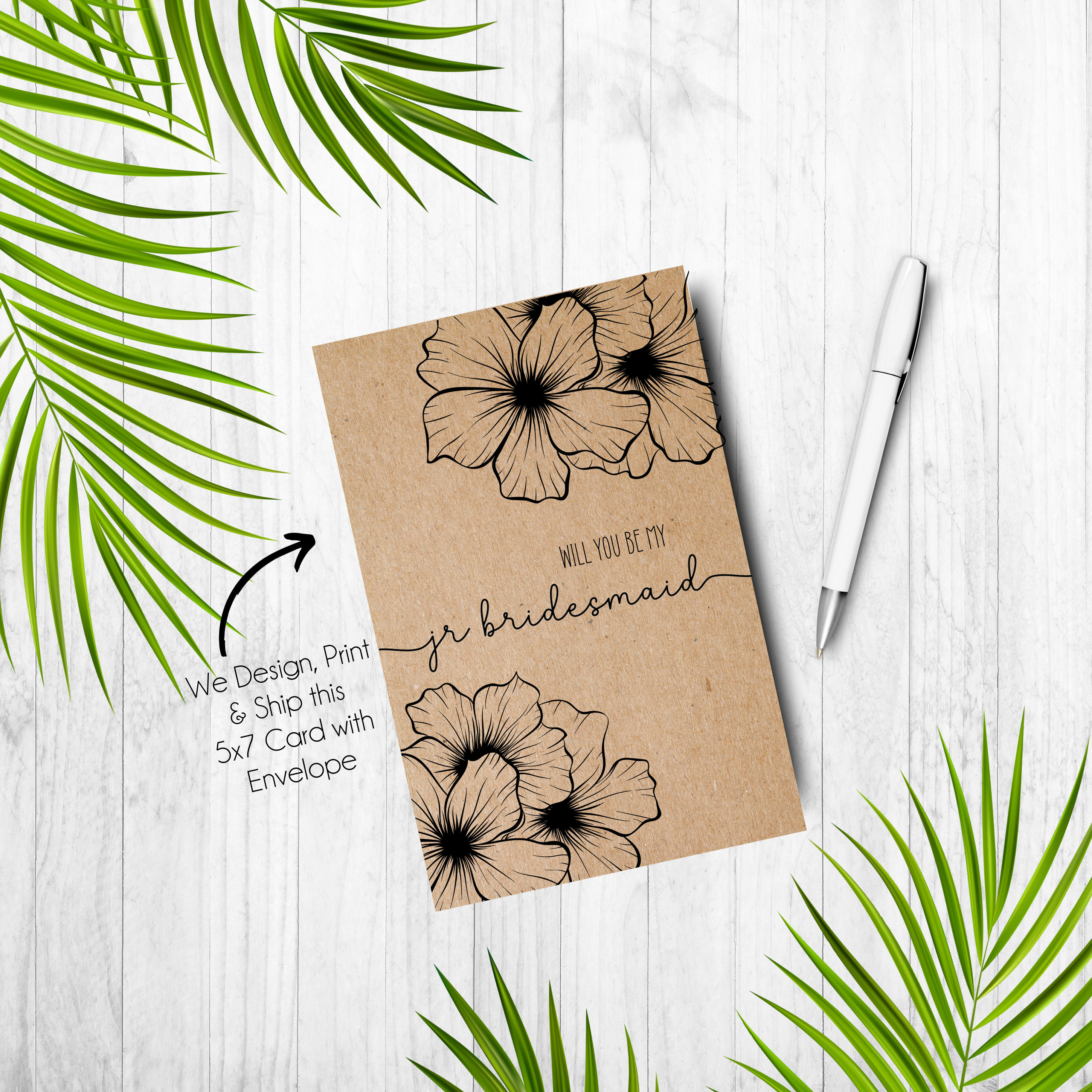 Bridesmaid proposals have become the trend. This cute hibiscus flower card is tropical, trendy, and perfect card to give to your future bridal party. This beach tropical card is made of kraft color card stock. It is the perfect way to ask your friends and family that important question.