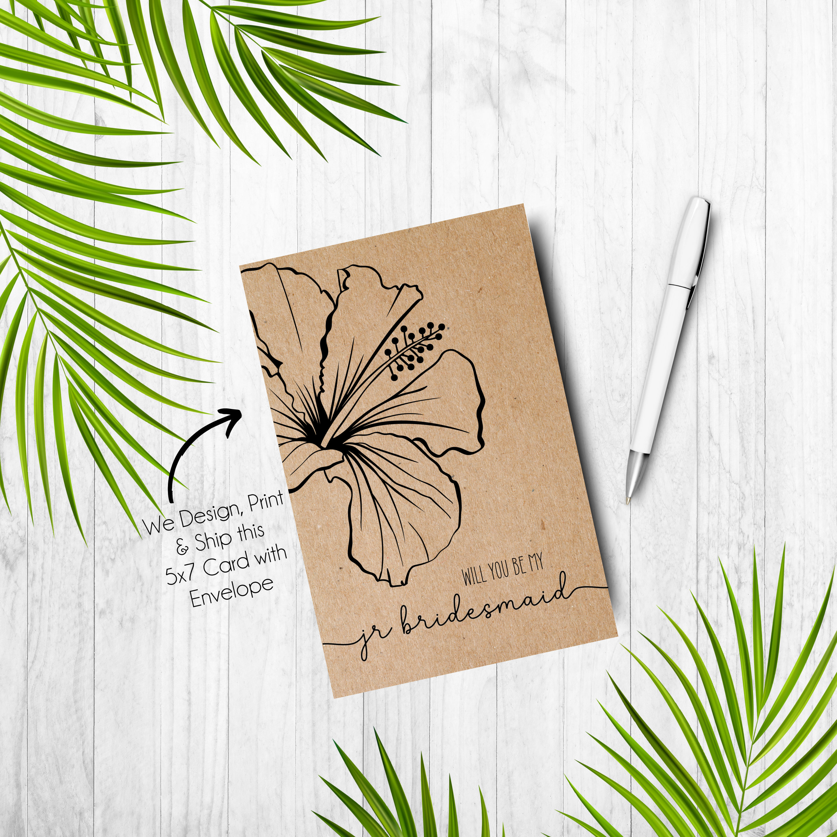 Bridesmaid proposals have become the trend. This cute hibiscus flower card is tropical, trendy, and perfect card to give to your future bridal party. This beach tropical card is made of kraft color card stock. It is the perfect way to ask your friends and family that important question.