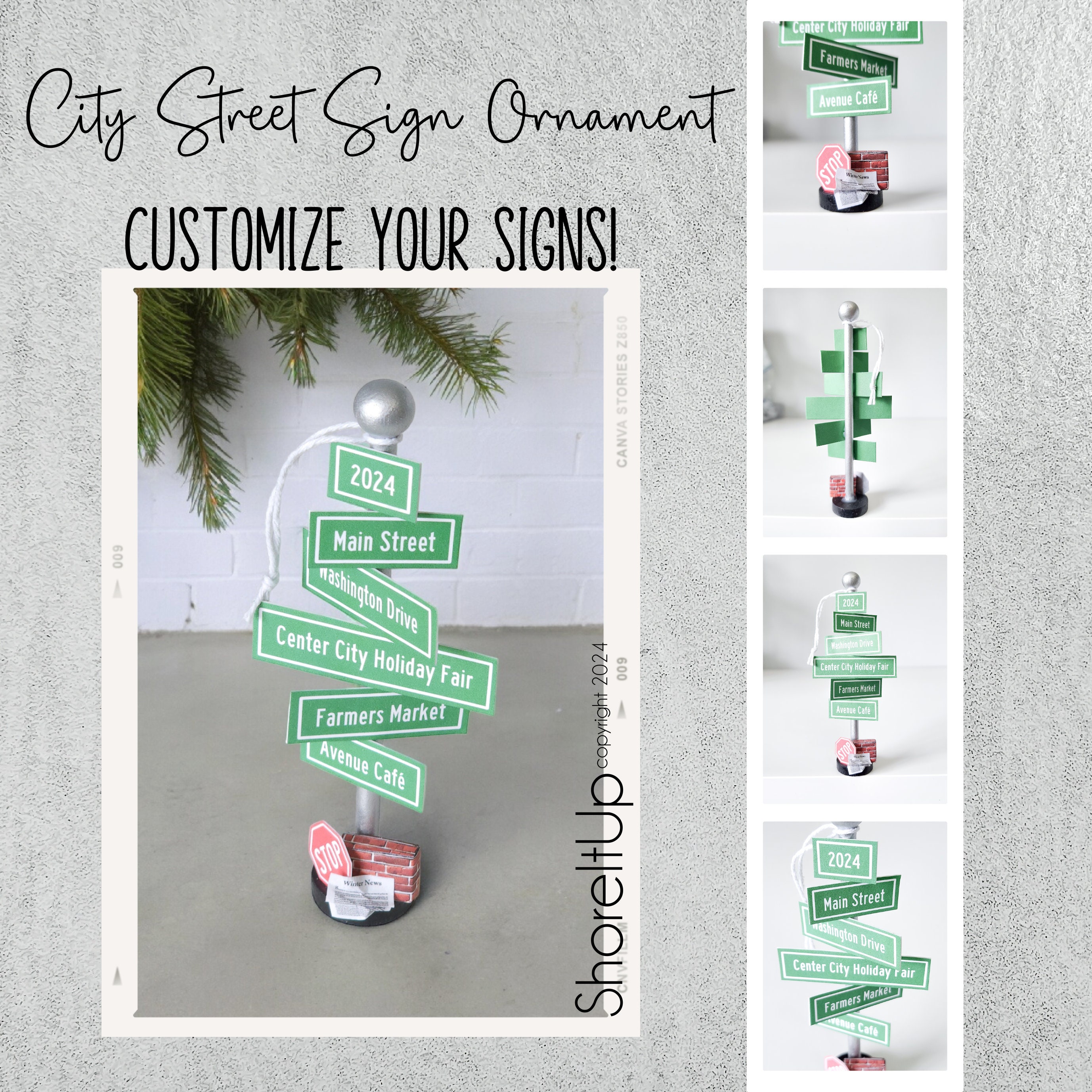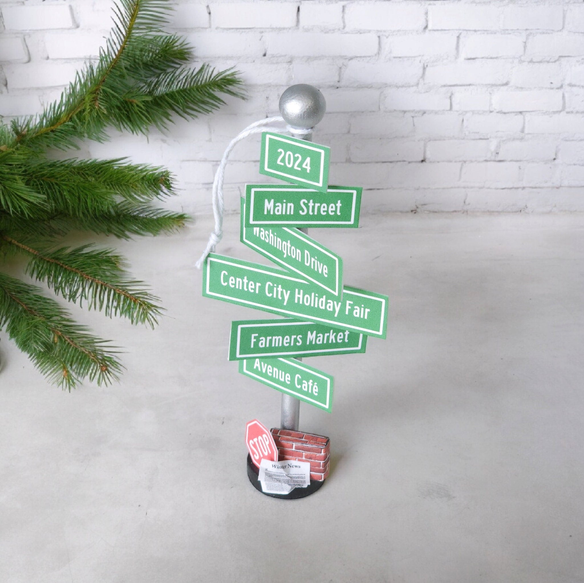 Crafted with care and artistry, this handmade ornament captures the city streets. The green and white signs, silver pole and black base is reminiscence of a city street. Adorned in classic red and white stop sign, brick wall, and blown over newspaper this ornament evokes the nostalgia of walk down a busy city street. Hang it proudly on your tree for a touch of festive charm.