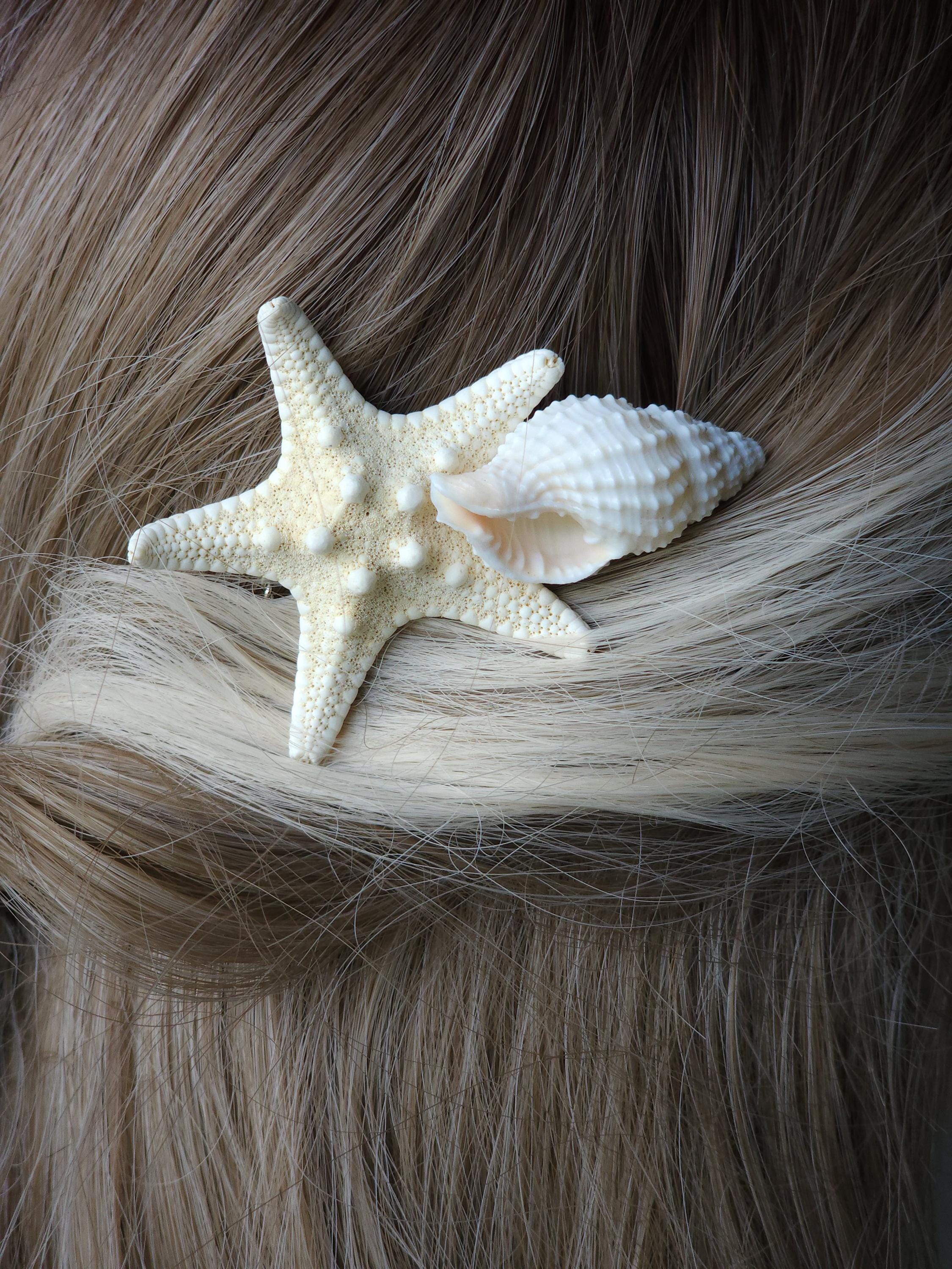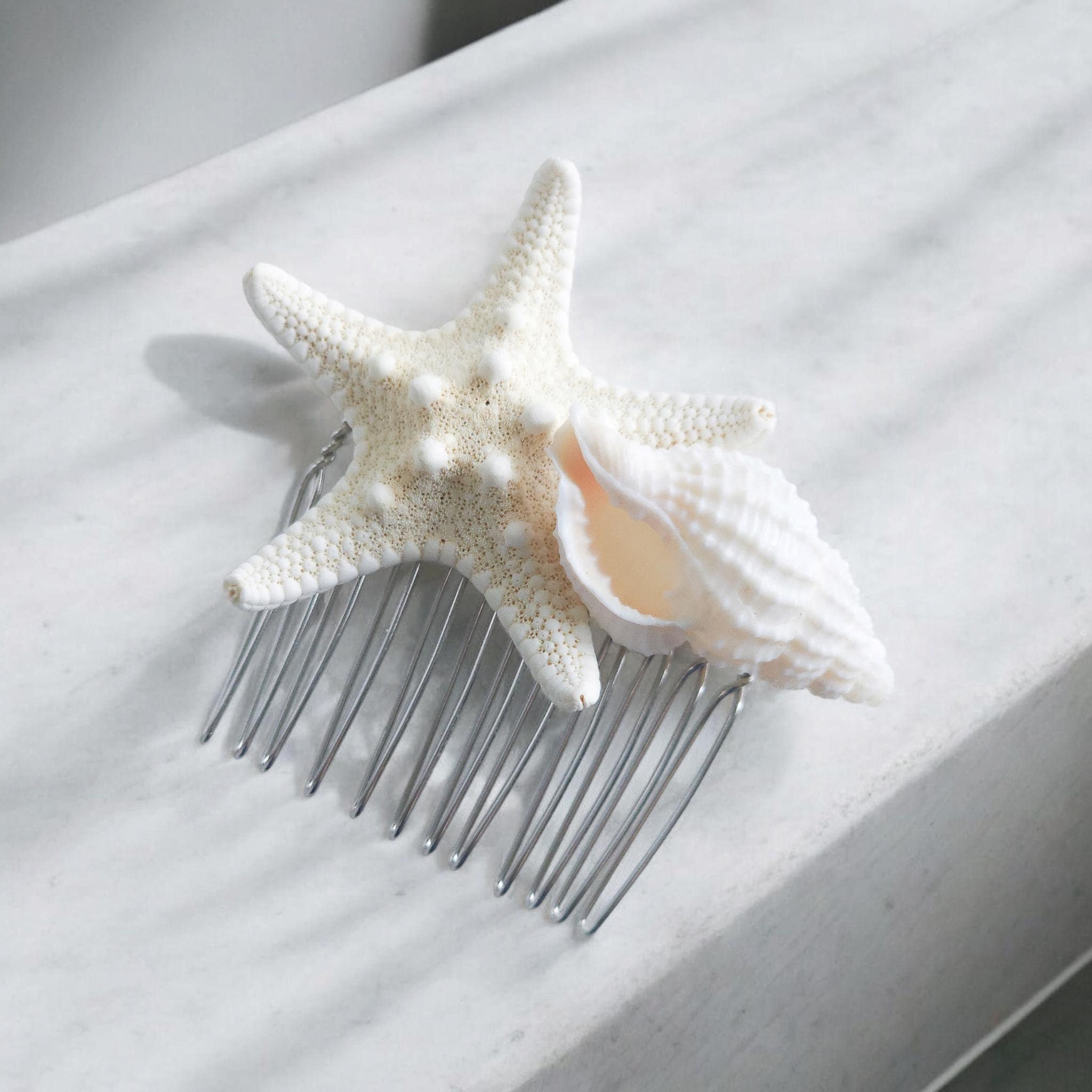 Our starfish and shell hair combs are perfect for that simple updo at your beach wedding. The hair comb is great to use with bobby pins to hold in place. Each piece is perfectly placed and permanently secured to the hair comb. Store in a dry place.