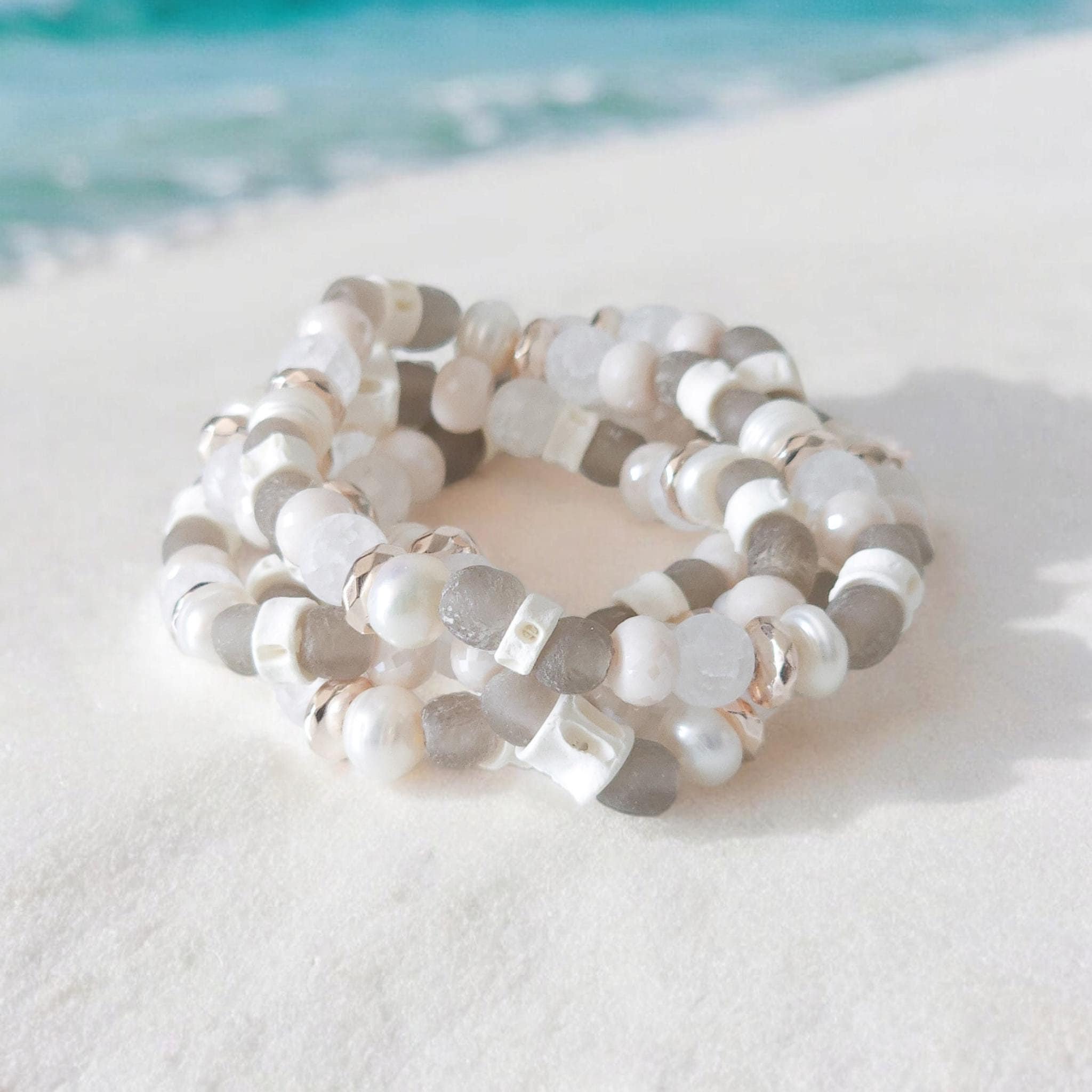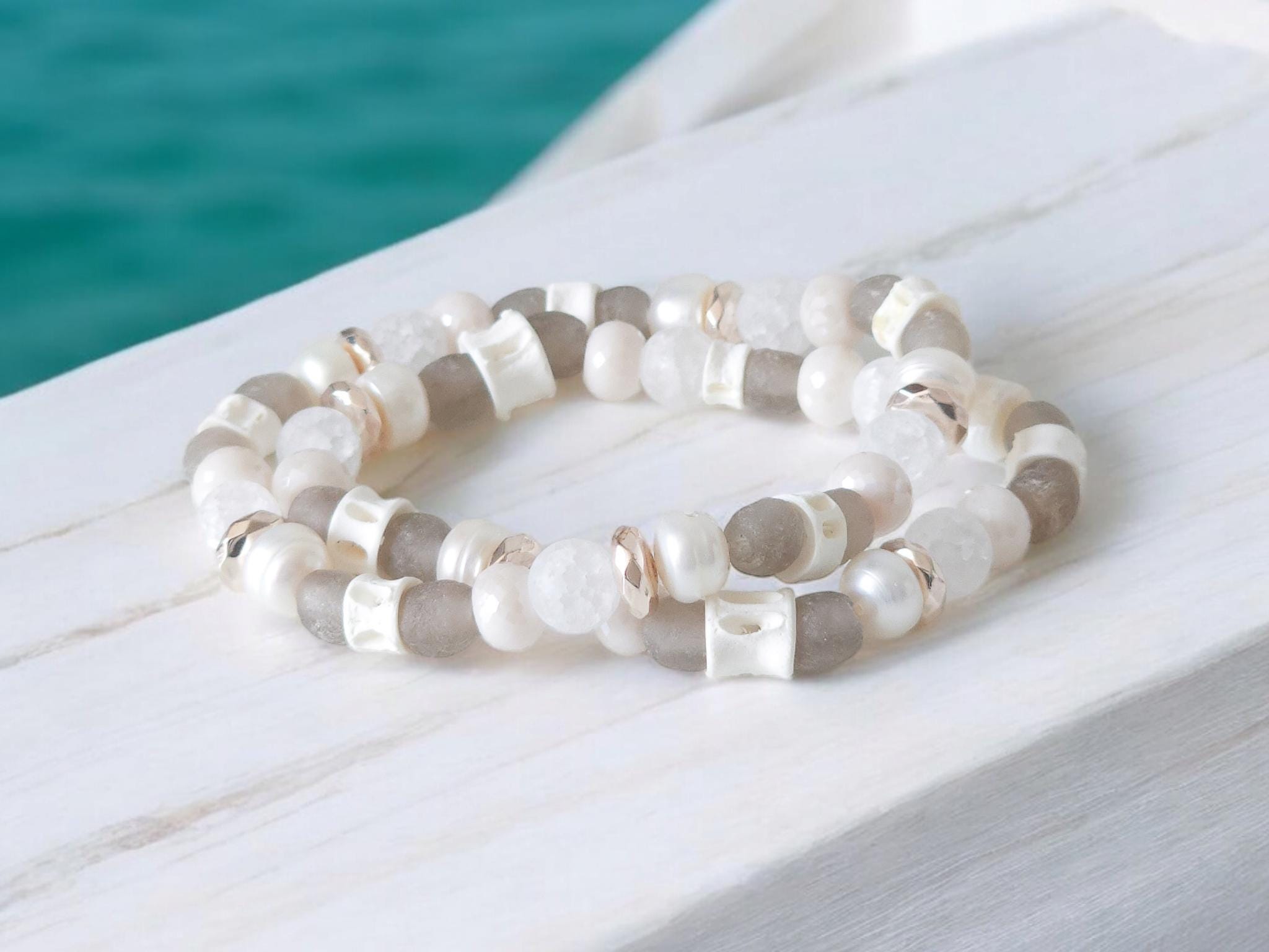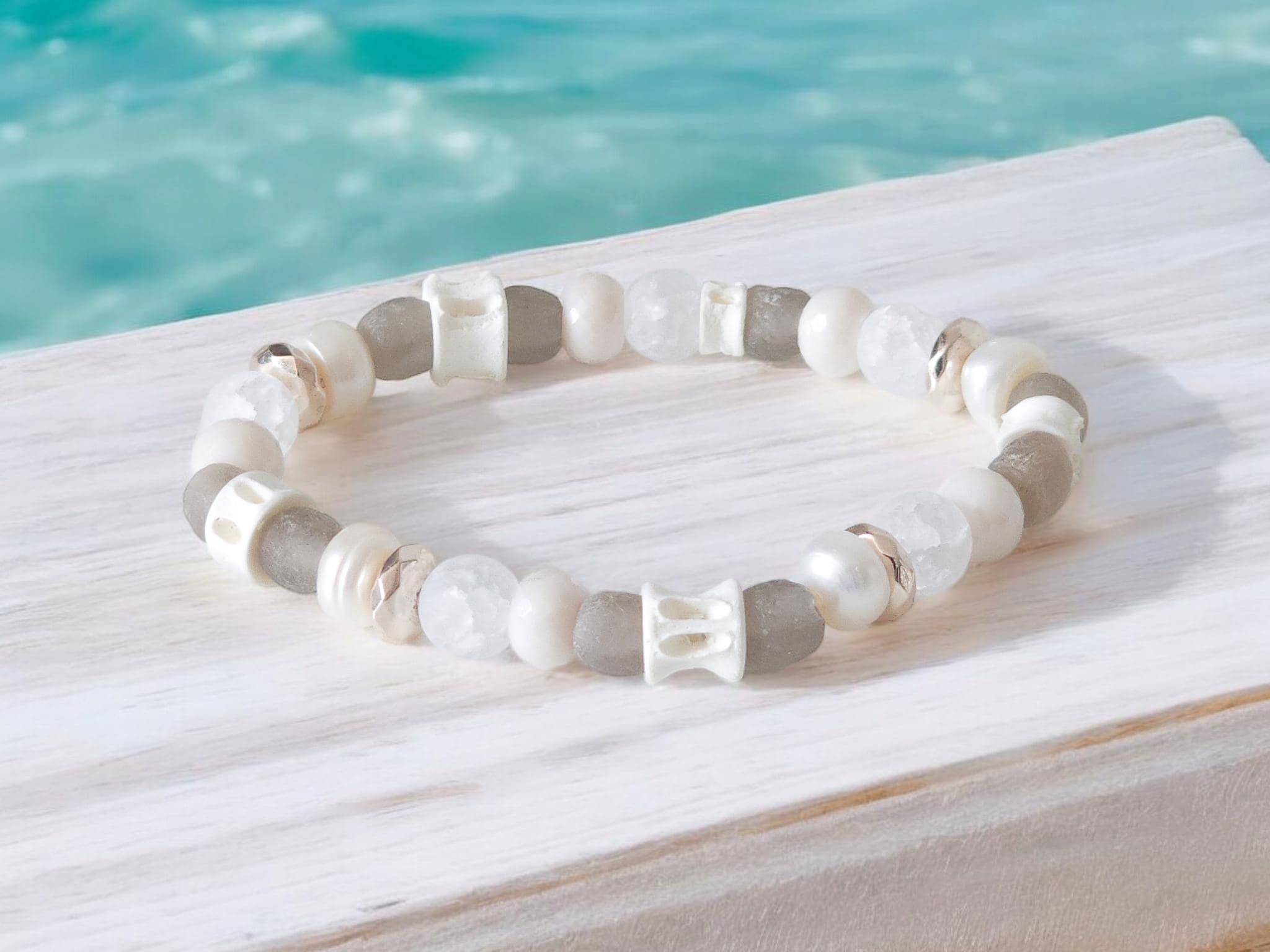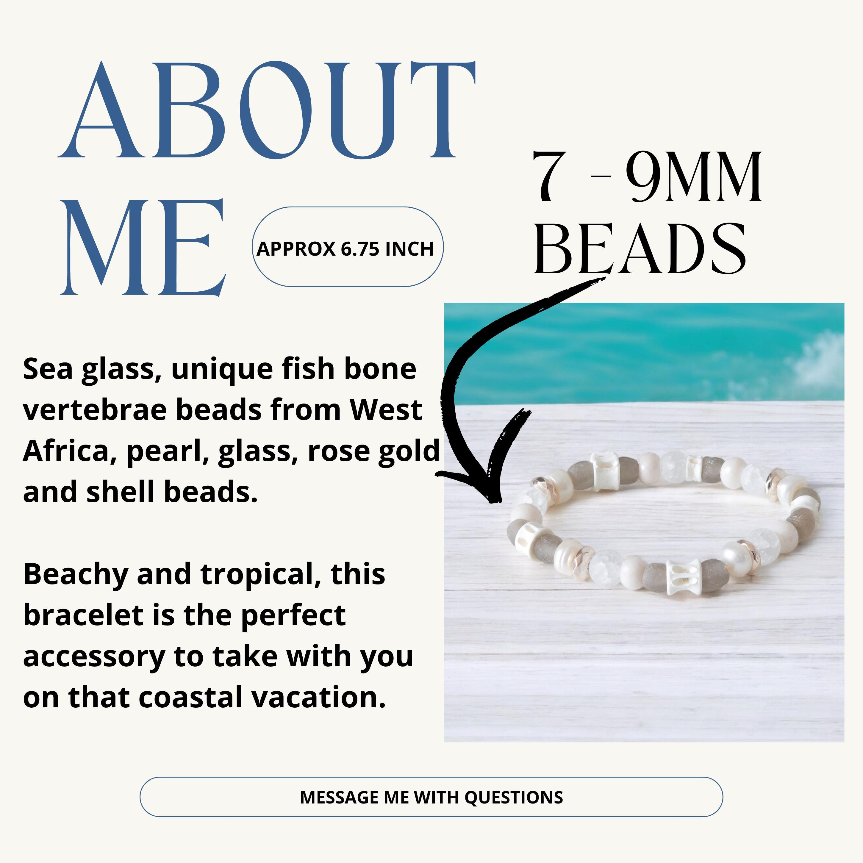 Handcrafted with meticulous care, this beach bracelet includes sea glass, pearl, shell, coconut, and unique fish bone vertebrae beads handmade in Africa. Each element tells a story of the sea, from the intricate fish bone bead to the shimmering sea glass bead, creating a unique piece that captures the essence of ocean treasures. The delicate rose gold accents add a touch of sophistication, complementing the natural beauty of the shell bead to perfection.