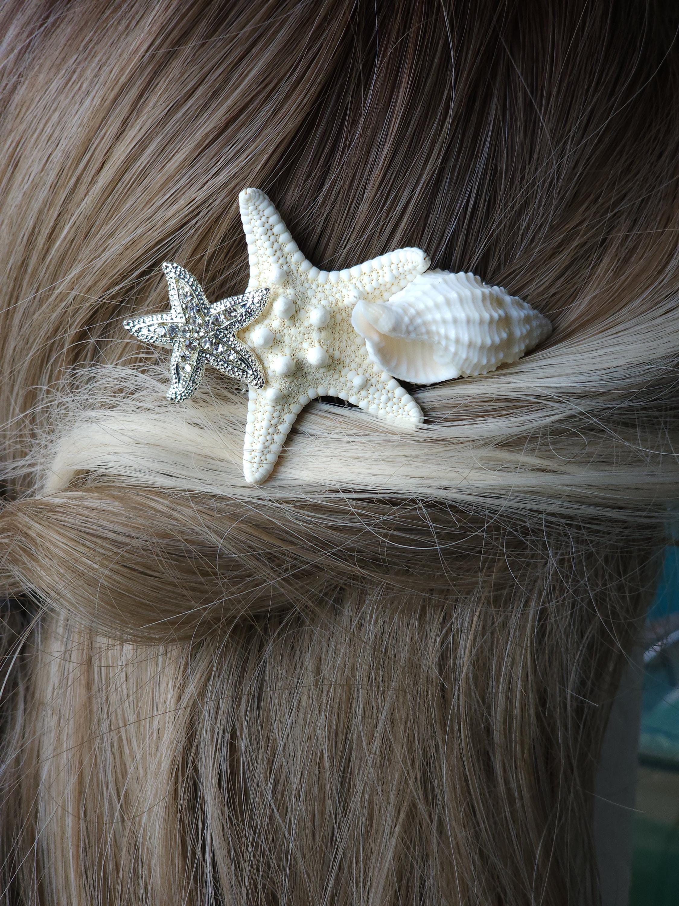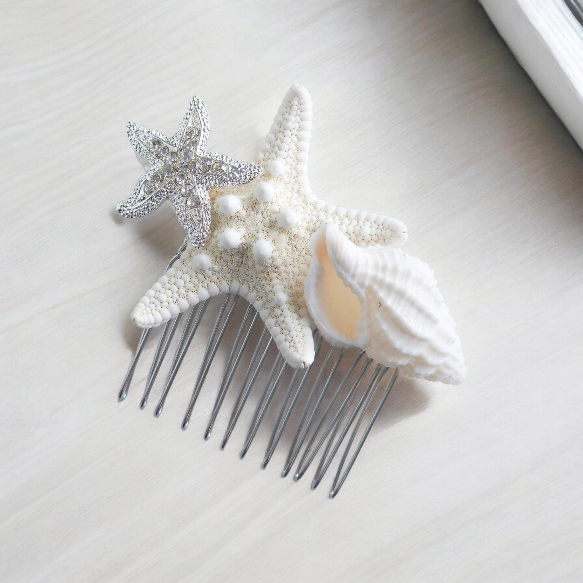 Our starfish and shell hair combs are perfect for that simple updo at your beach wedding. The hair comb is great to use with bobby pins to hold in place. Each piece is perfectly placed and permanently secured to the hair comb. Store in a dry place.