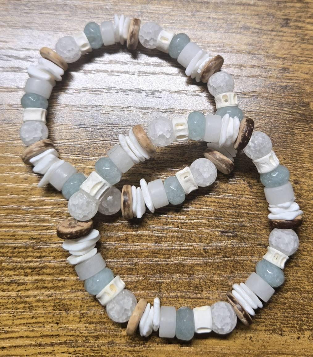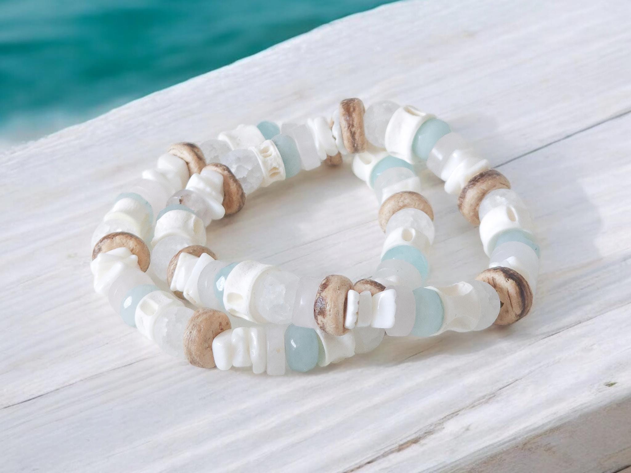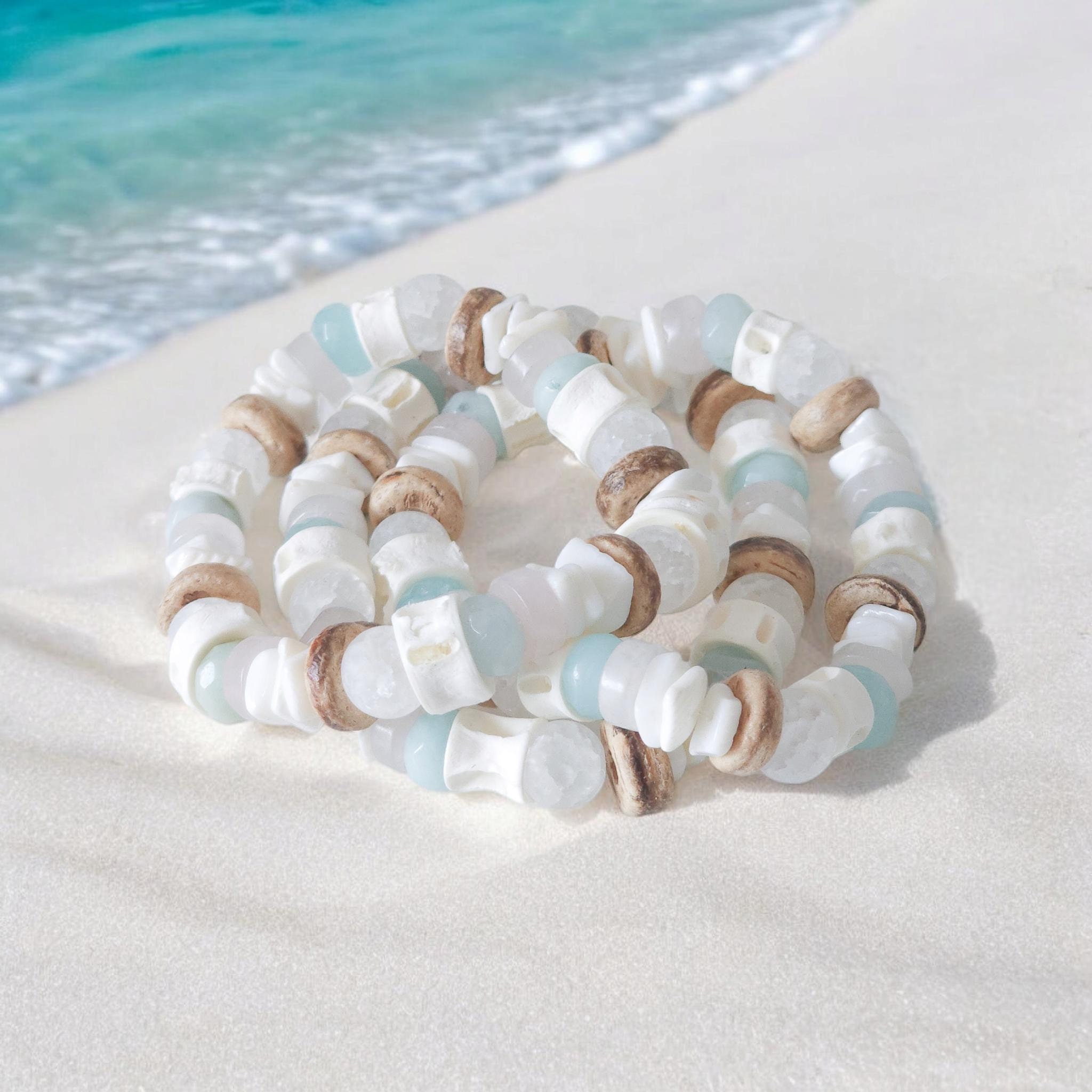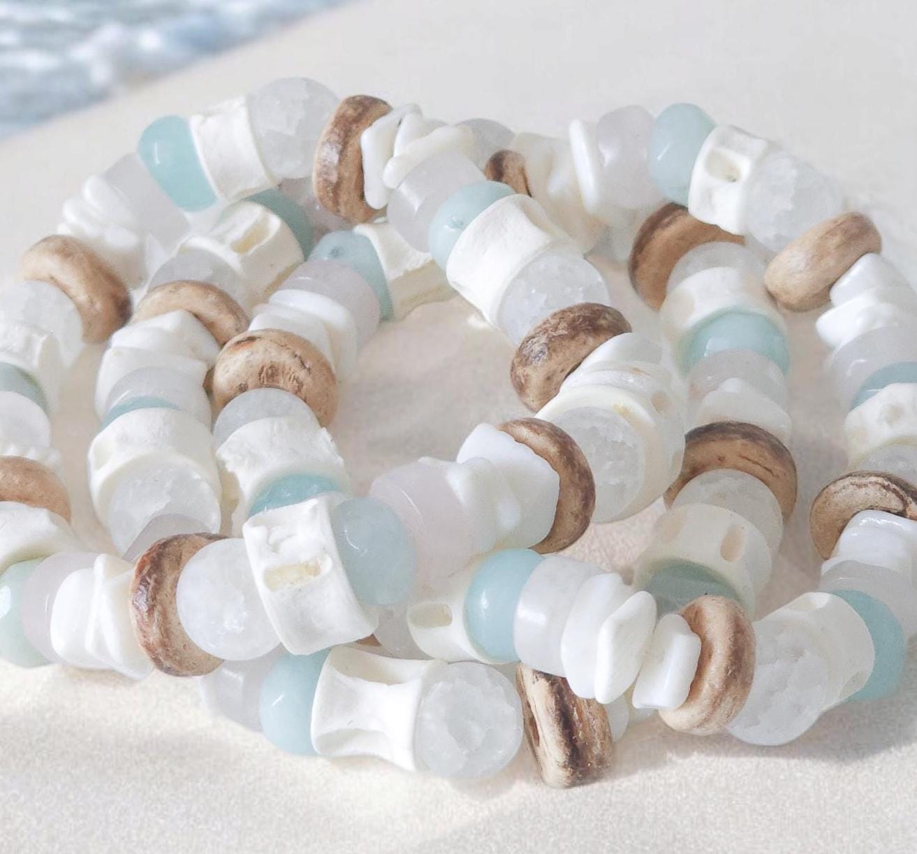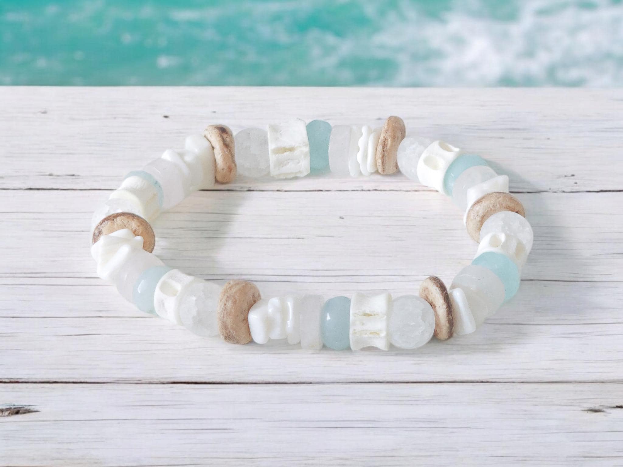 Handcrafted with meticulous care, this beach bracelet includes sea glass, aquamarine, shell, coconut, and unique fish bone vertebrae beads handmade in Africa. Each element tells a story of the sea, from the intricate fish bone bead to the shimmering sea glass bead, creating a unique piece that captures the essence of ocean treasures. The delicate coconut shell accents add a touch of sophistication, complementing the natural beauty of the shell bead to perfection.