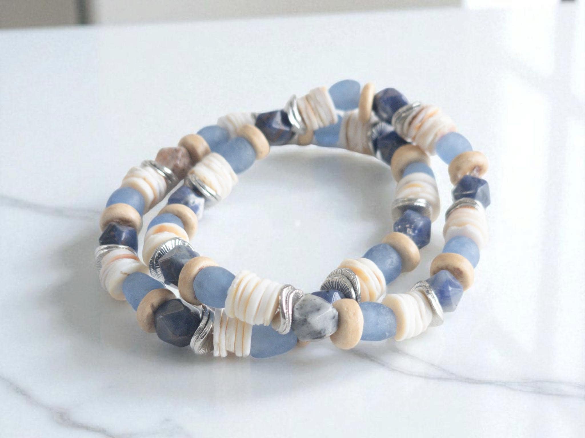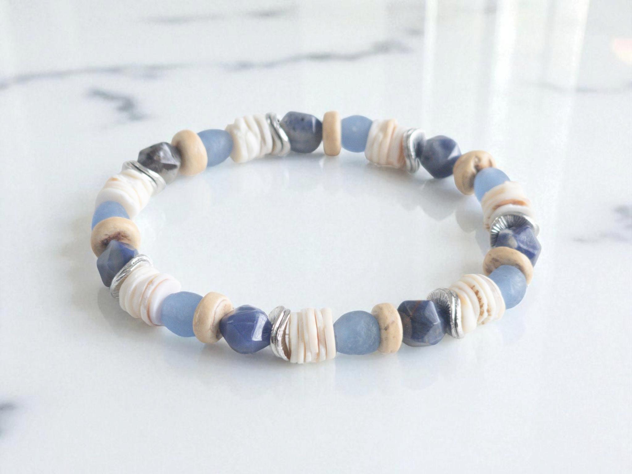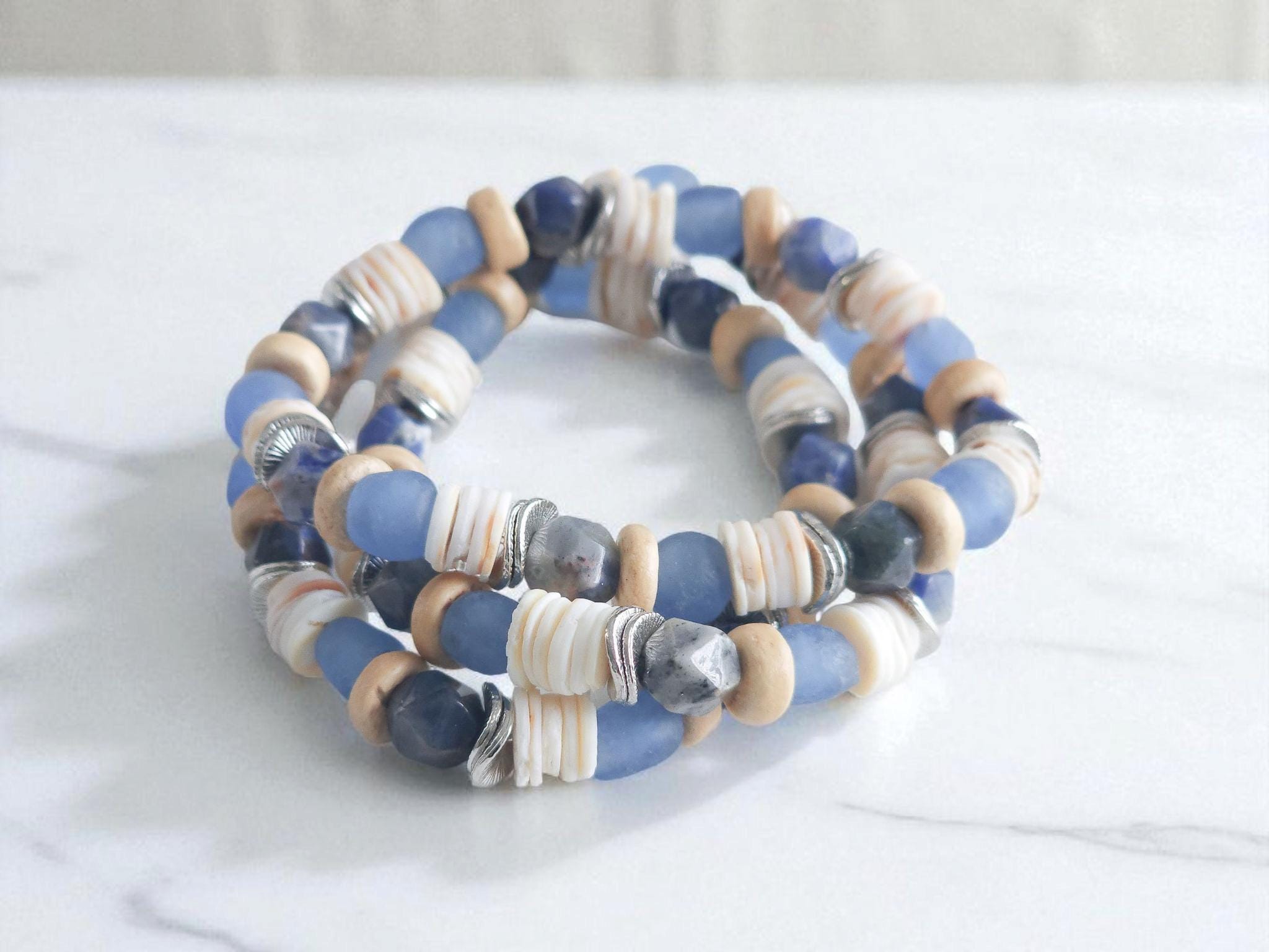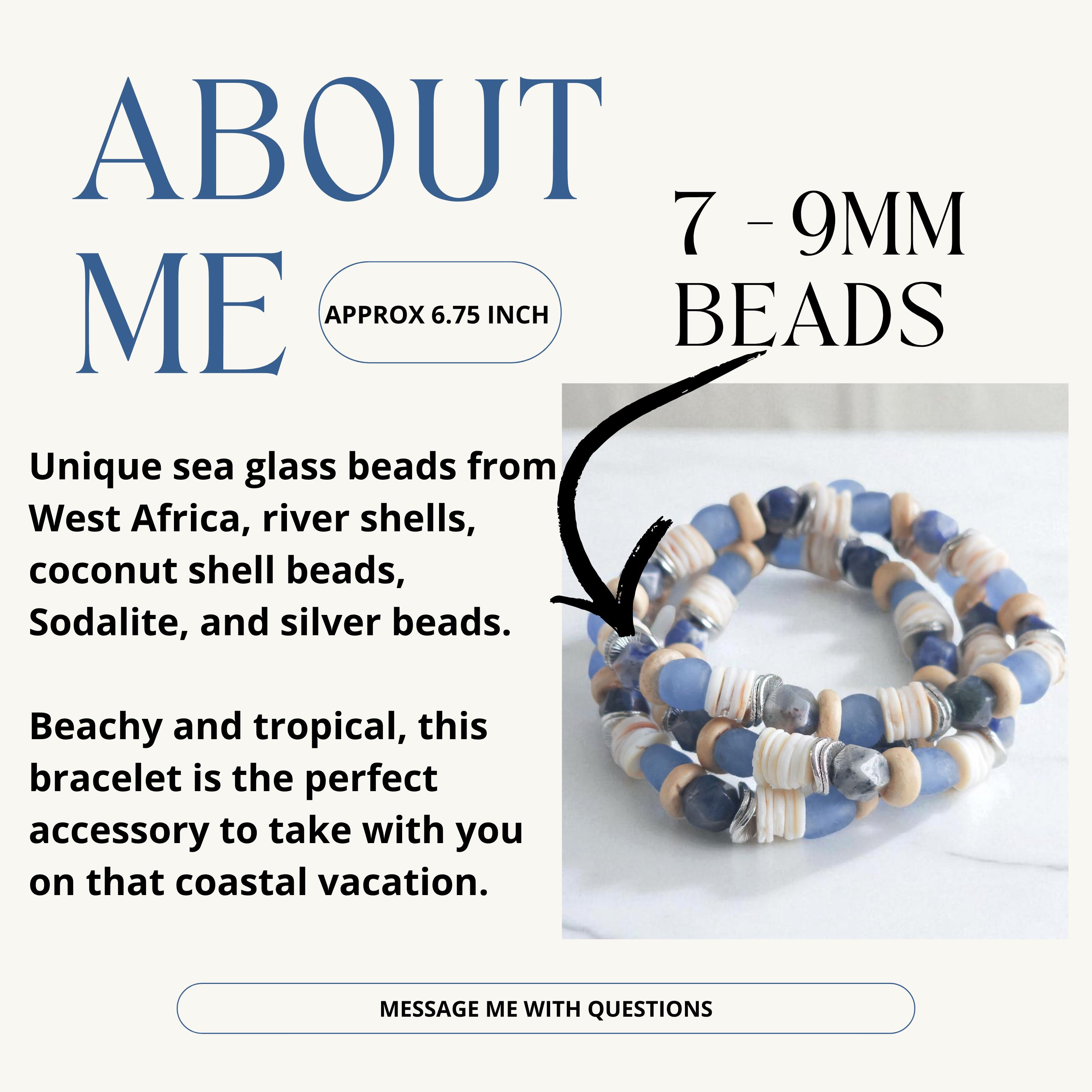 Handcrafted with meticulous care, this beach bracelet includes sea glass, river shells, coconut shell, siver, and sodalite beads. Each element tells a story of the sea, from the river shells to the sea glass, creating a unique piece that captures the essence of ocean treasures. The delicate silver accents add a touch of sophistication, complementing the natural beauty of the shell bead to perfection.