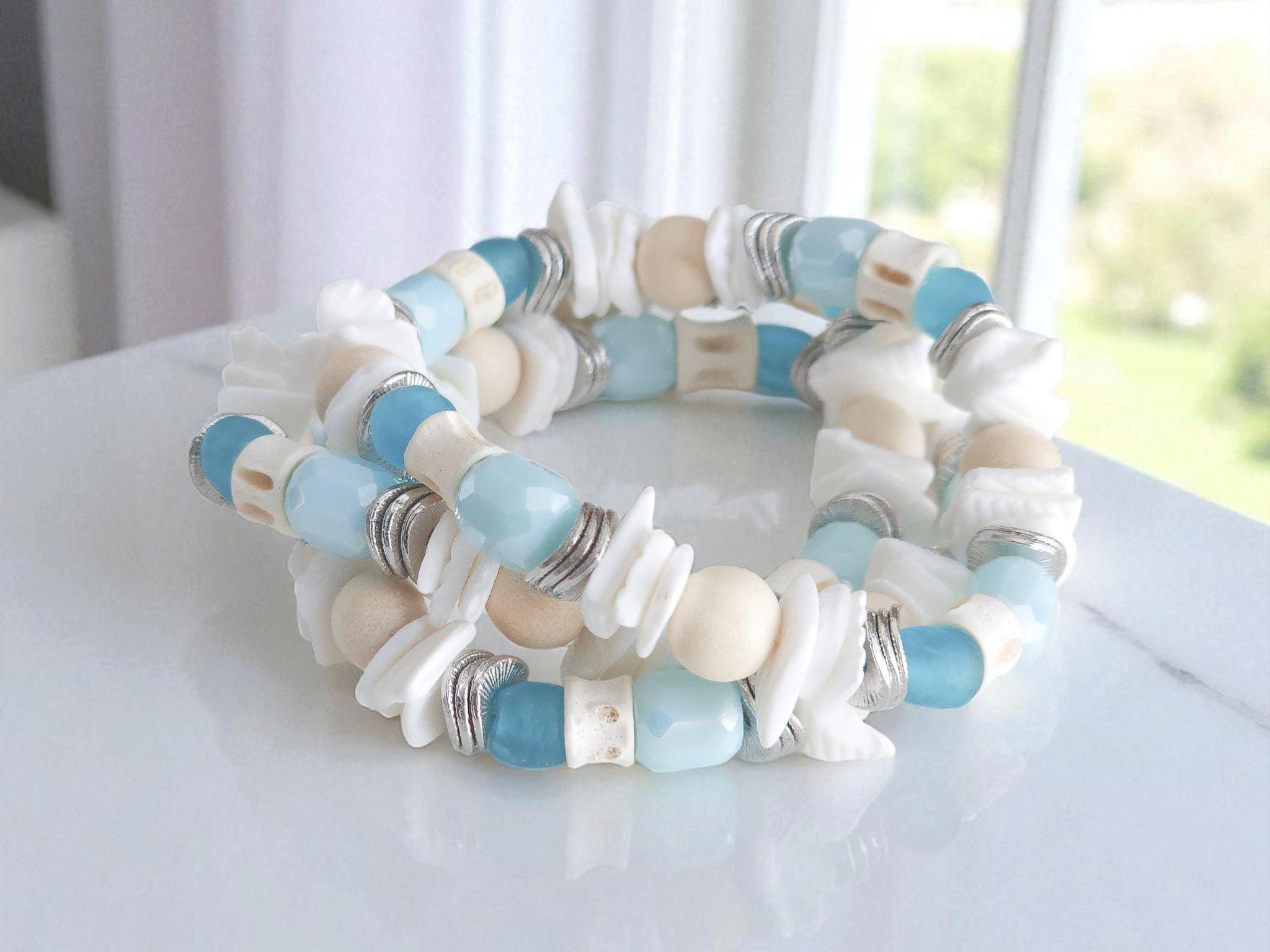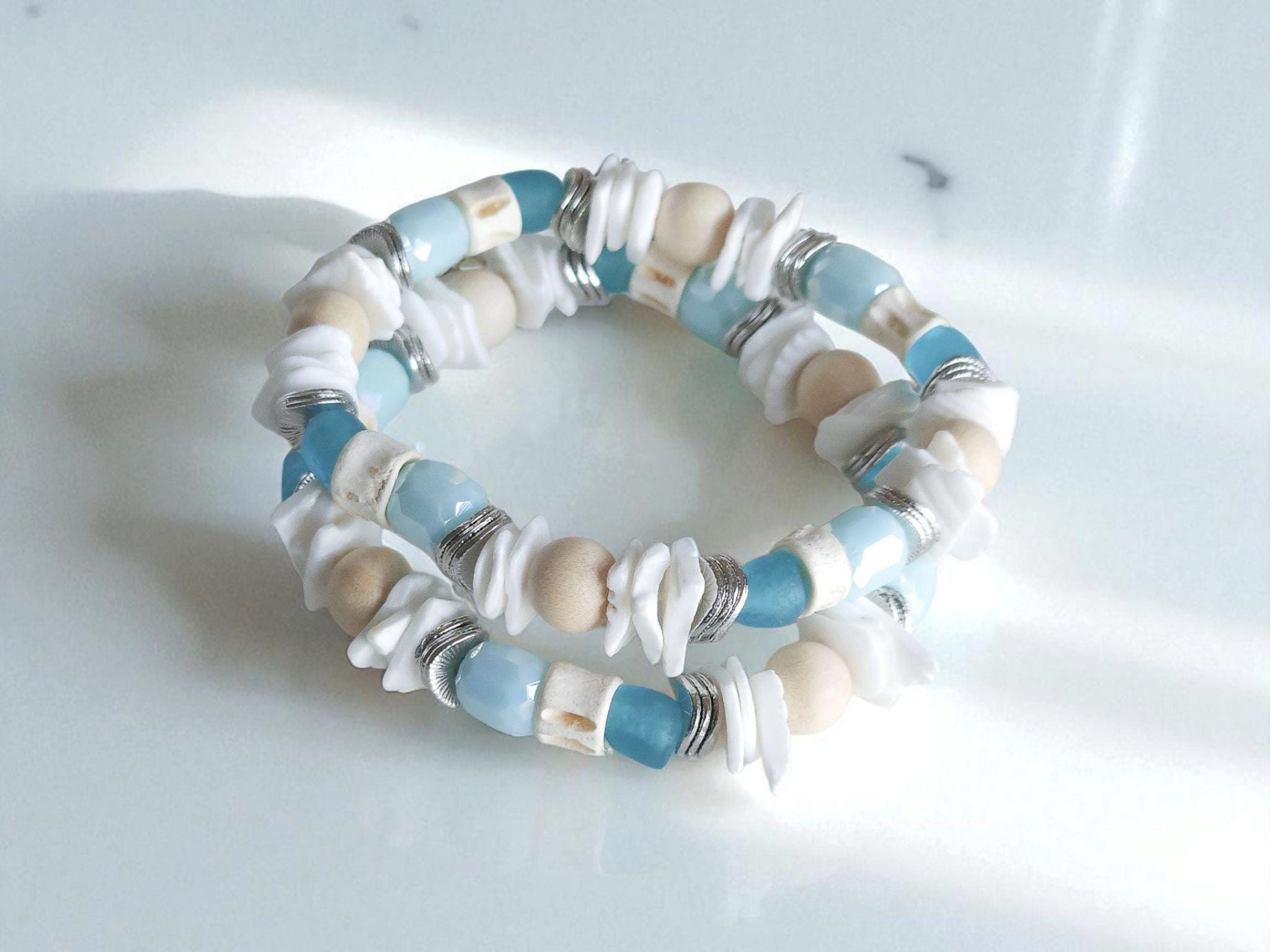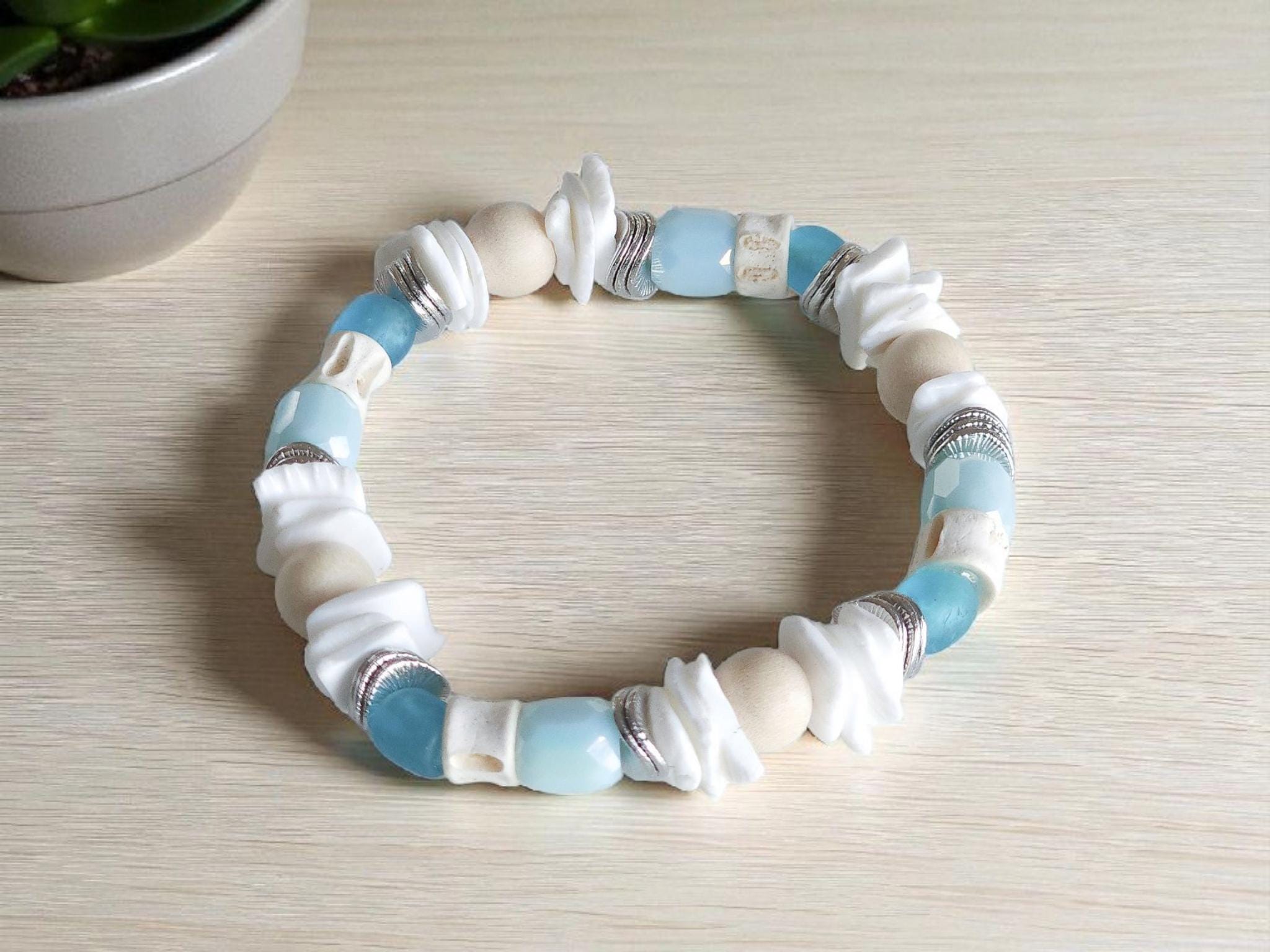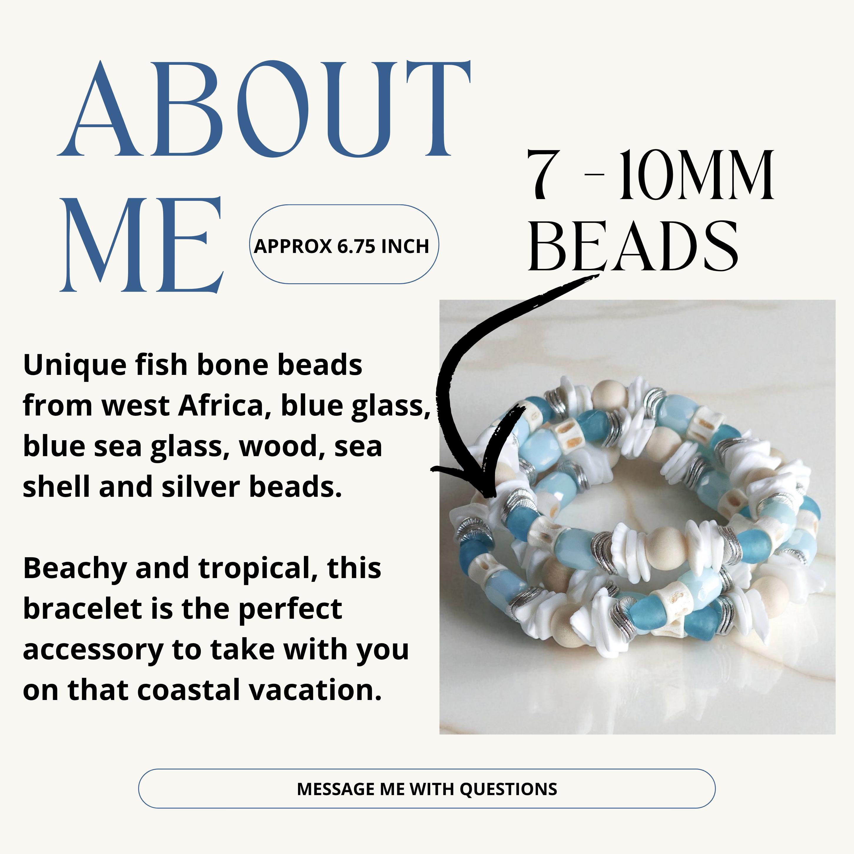 Handcrafted with meticulous care, this beach bracelet includes sea glass, shell, silver, wood, and unique fish bone vertebrae beads handmade in Africa. Each element tells a story of the sea, from the intricate fish bone bead to the shimmering sea glass bead, creating a unique piece that captures the essence of ocean treasures. The delicate silver accents add a touch of sophistication, complementing the natural beauty of the shell bead to perfection.