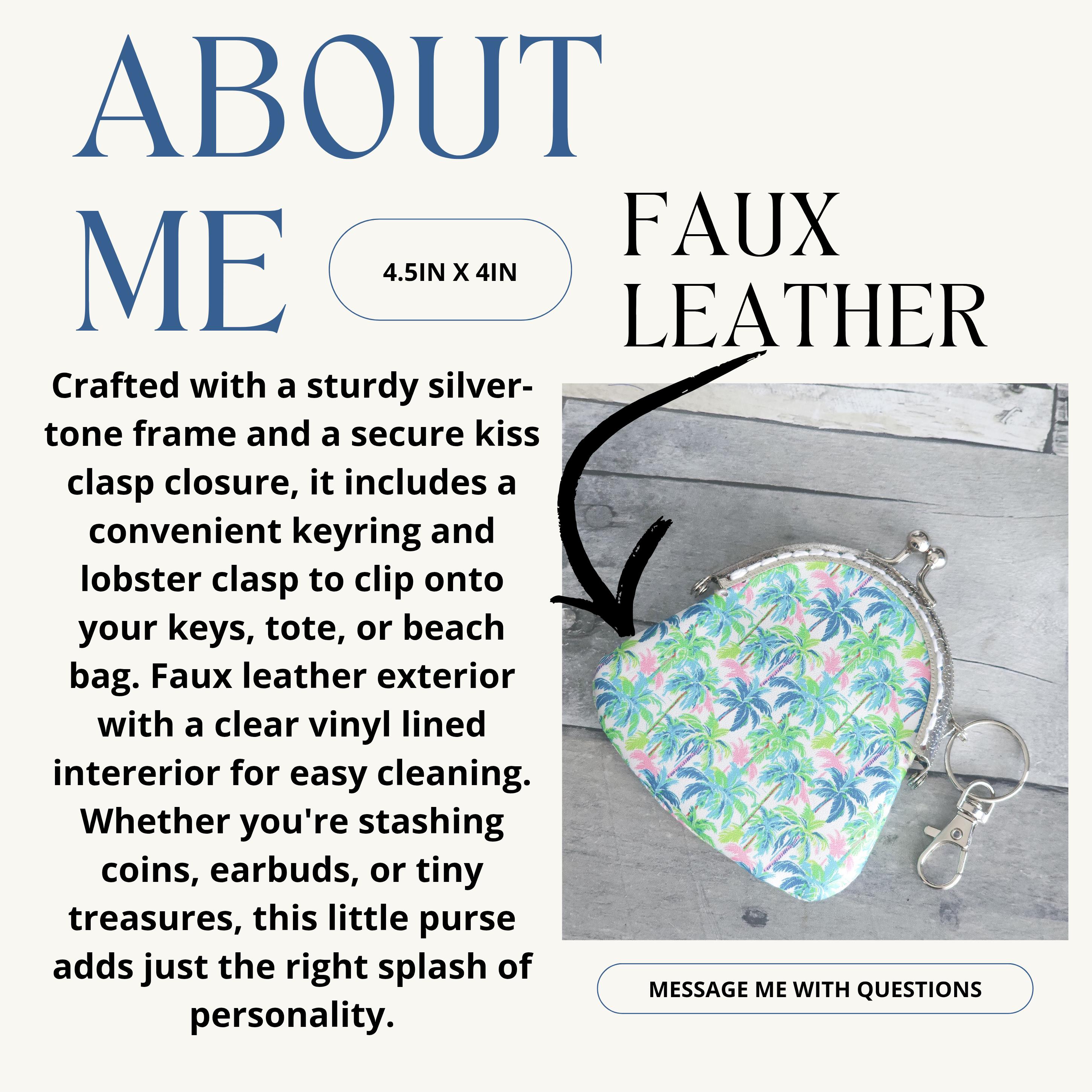 Crafted with a sturdy silver-tone frame and a secure kiss clasp closure, it includes a convenient keyring and lobster clasp to clip onto your keys, tote, or beach bag. Faux leather exterior with a clear vinyl lined intererior for easy cleaning. Whether you're stashing coins, earbuds, or tiny treasures, this little purse adds just the right splash of personality.