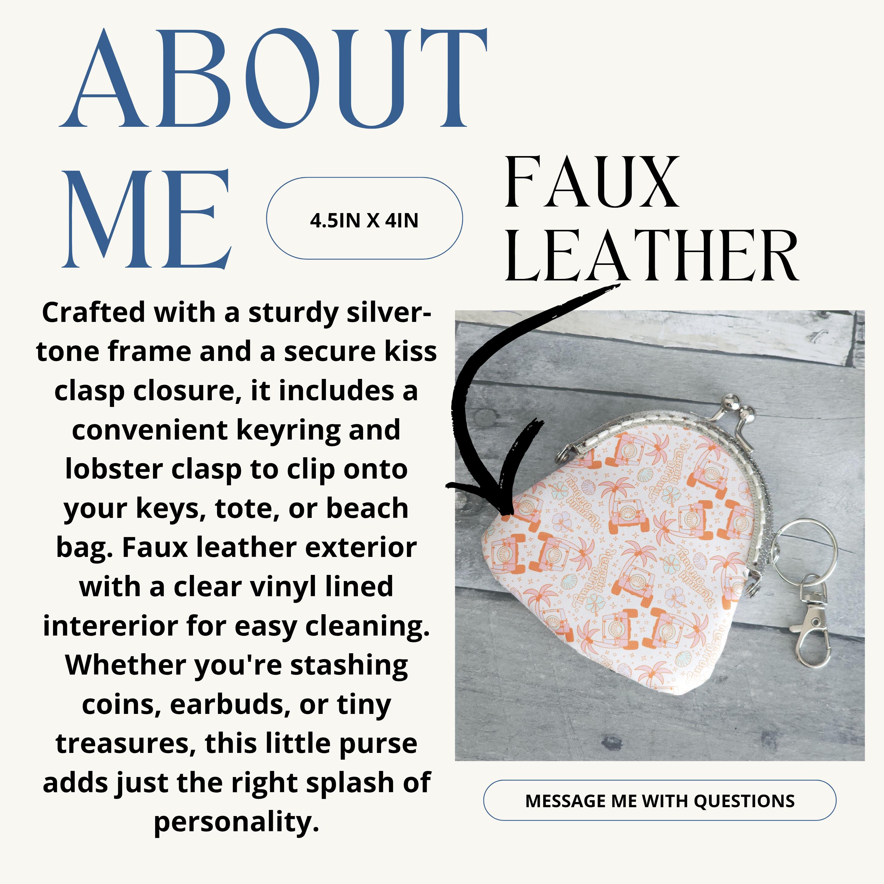 Crafted with a sturdy silver-tone frame and a secure kiss clasp closure, it includes a convenient keyring and lobster clasp to clip onto your keys, tote, or beach bag. Faux leather exterior with a clear vinyl lined intererior for easy cleaning. Whether you're stashing coins, earbuds, or tiny treasures, this little purse adds just the right splash of personality.