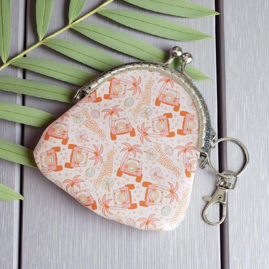Say aloha to your new favorite mini essential! This charming kiss clasp coin purse features a playful, vintage-style tropical print in soft pinks and coral tones — complete with retro style jeep. It’s the perfect accessory to carry a bit of paradise with you wherever you go!
