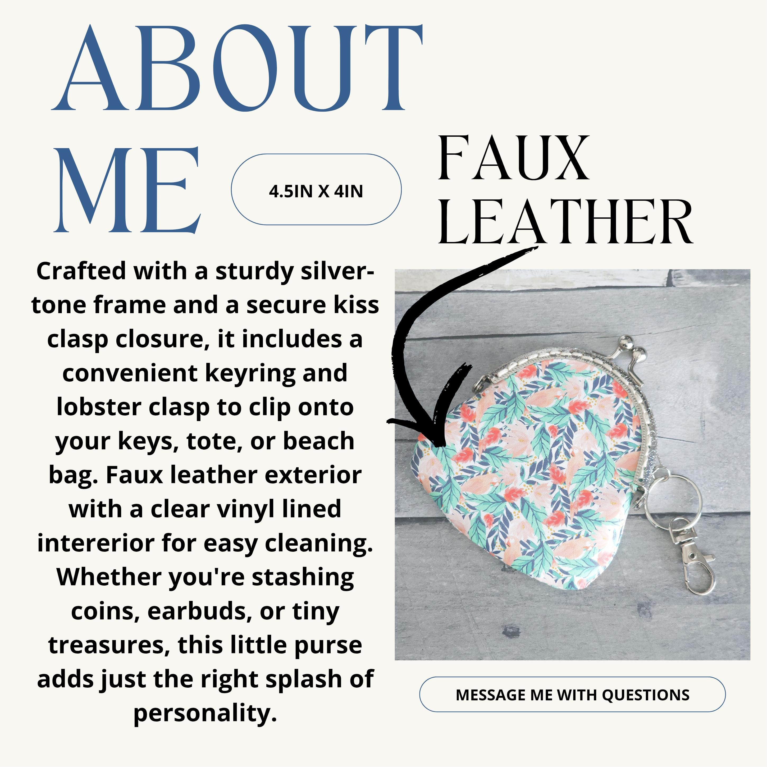 Crafted with a sturdy silver-tone frame and a secure kiss clasp closure, it includes a convenient keyring and lobster clasp to clip onto your keys, tote, or beach bag. Faux leather exterior with a clear vinyl lined intererior for easy cleaning. Whether you're stashing coins, earbuds, or tiny treasures, this little purse adds just the right splash of personality.