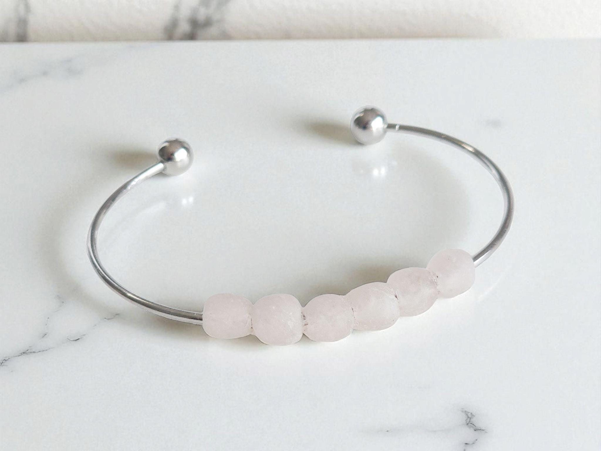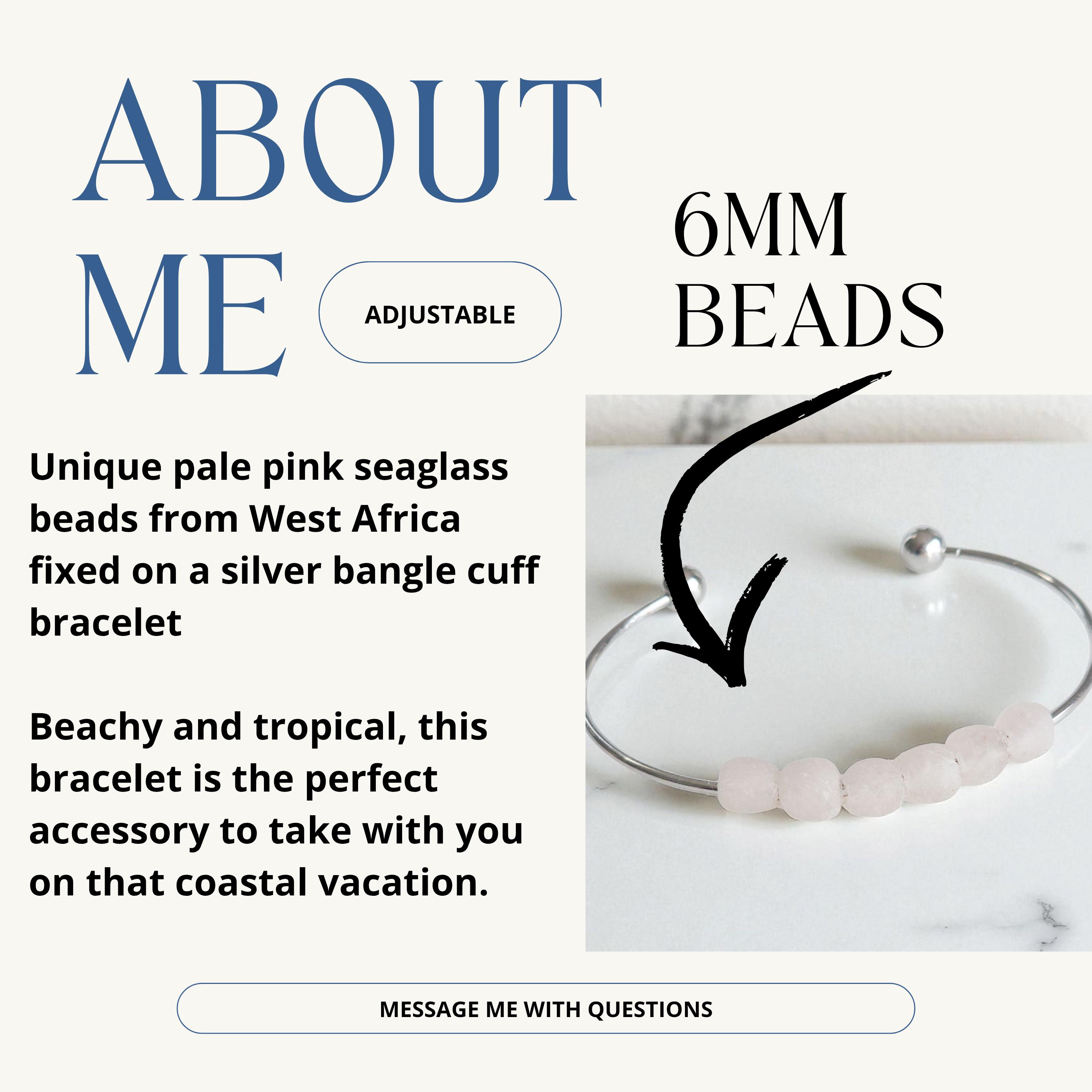 Embrace coastal elegance with this minimalist cuff bracelet featuring genuine hand-crafted pale pink sea glass beads from West Africa. Each bead is individually shaped using traditional methods, giving it a frosted, ocean-worn look that evokes the calm of the sea.