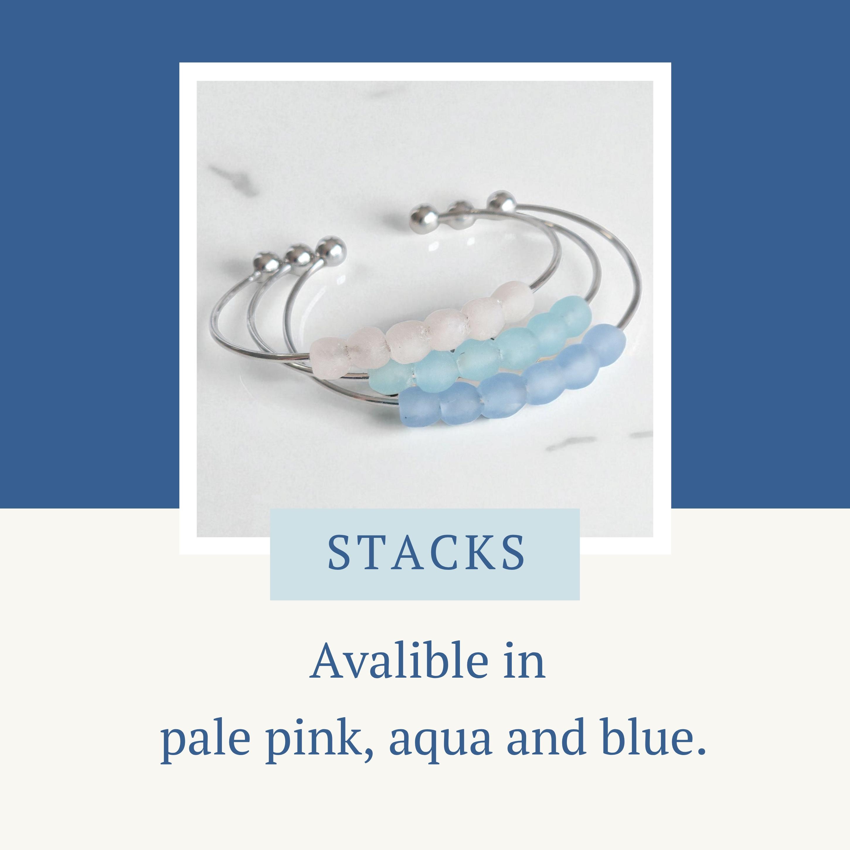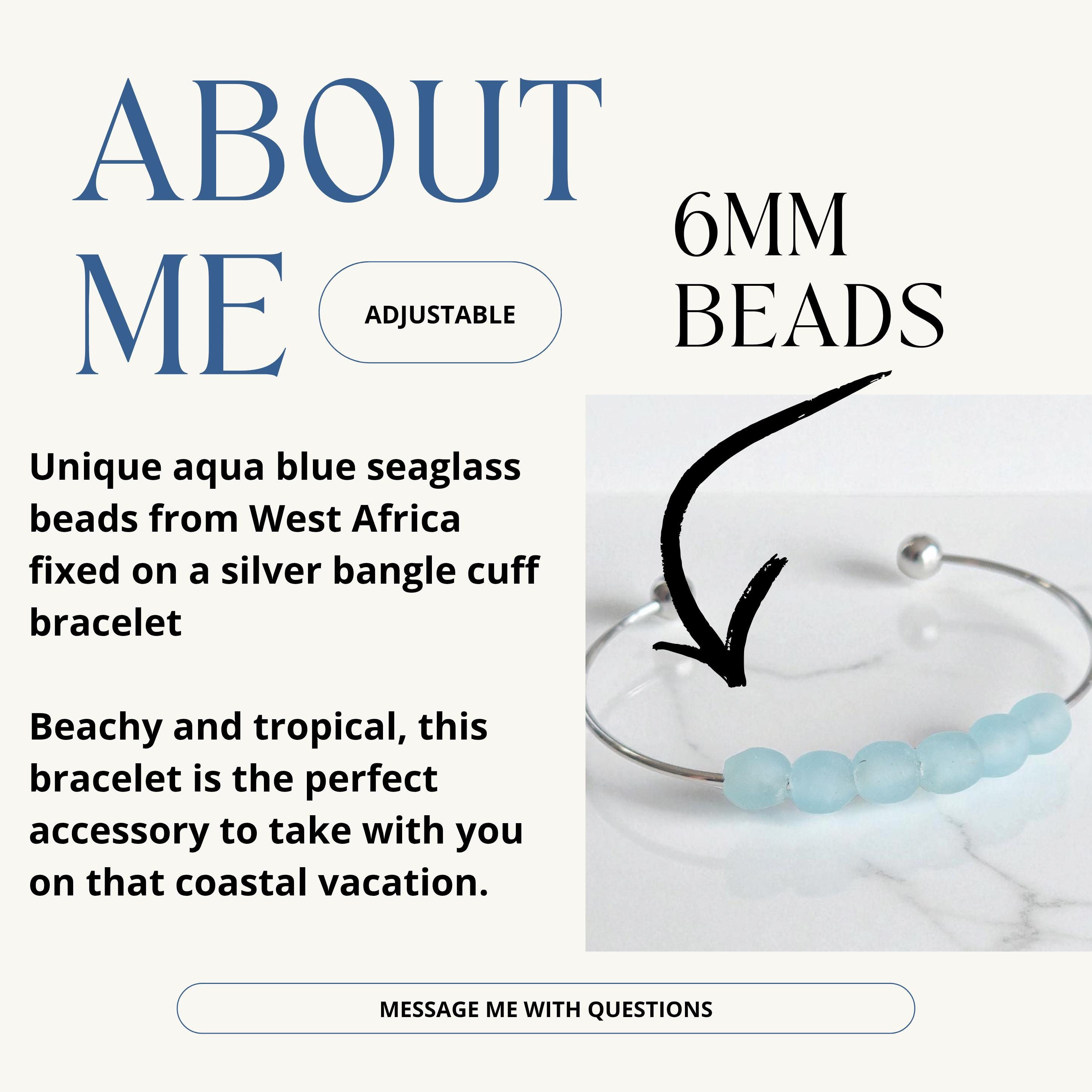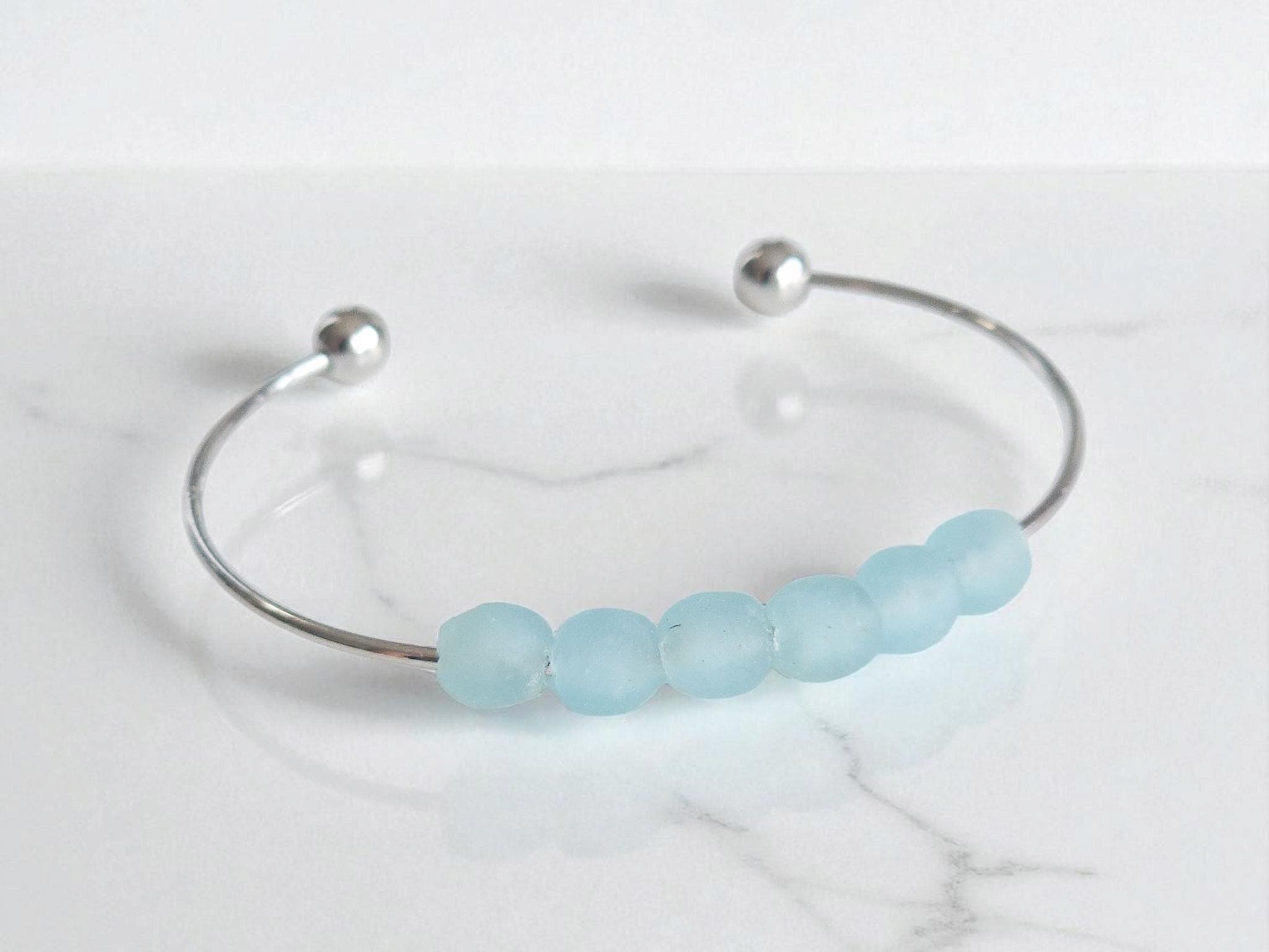 Embrace coastal elegance with this minimalist cuff bracelet featuring genuine hand-crafted pale aqua sea glass beads from West Africa. Each bead is individually shaped using traditional methods, giving it a frosted, ocean-worn look that evokes the calm of the sea.