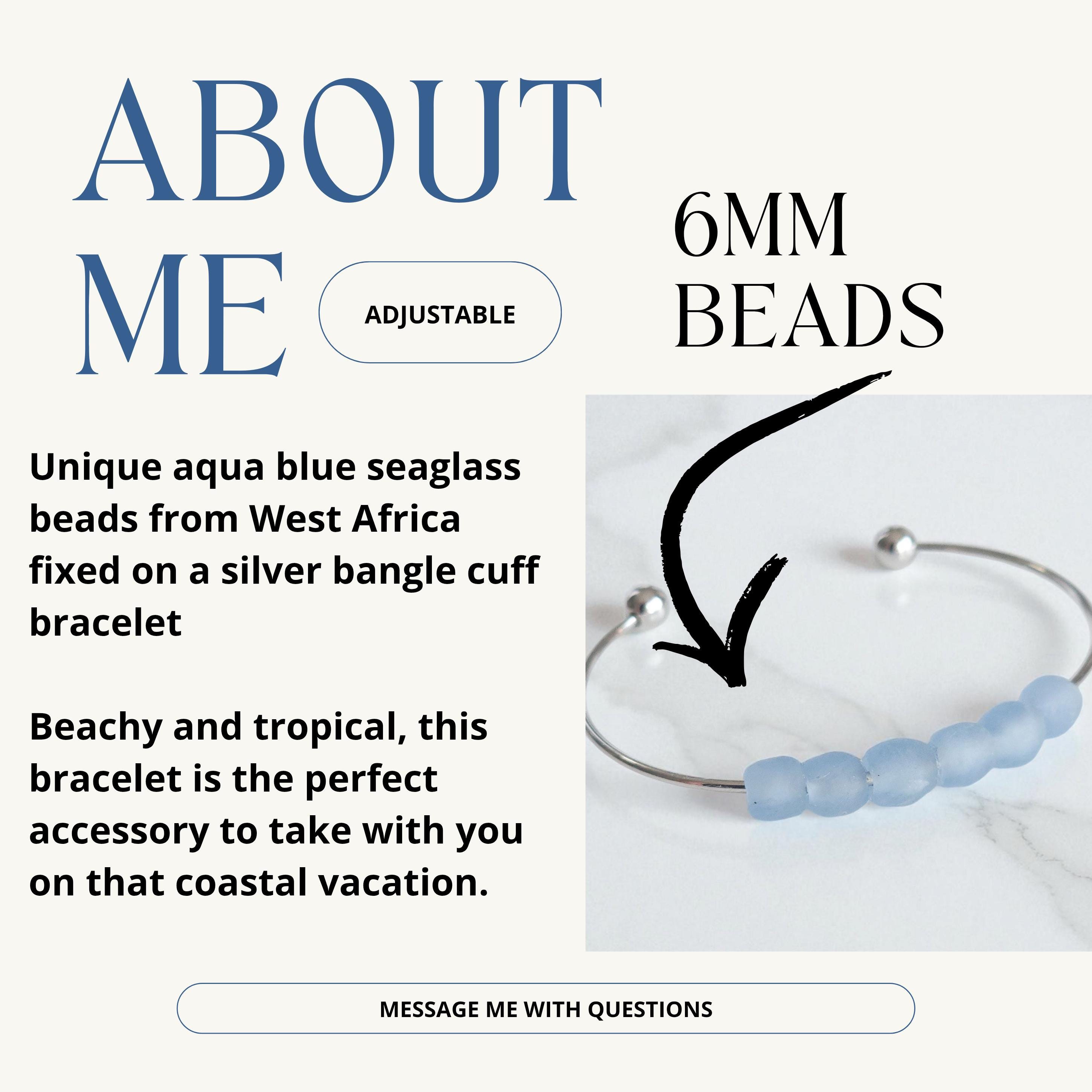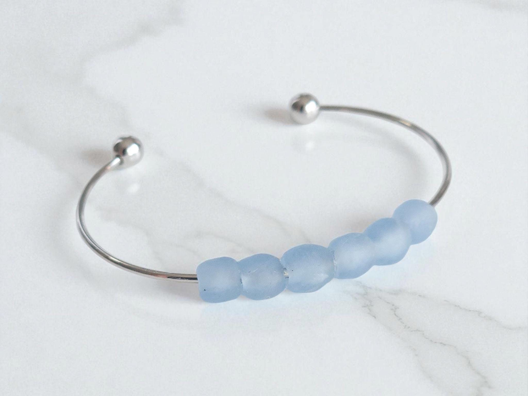 Embrace coastal elegance with this minimalist cuff bracelet featuring genuine hand-crafted pale blue sea glass beads from West Africa. Each bead is individually shaped using traditional methods, giving it a frosted, ocean-worn look that evokes the calm of the sea.