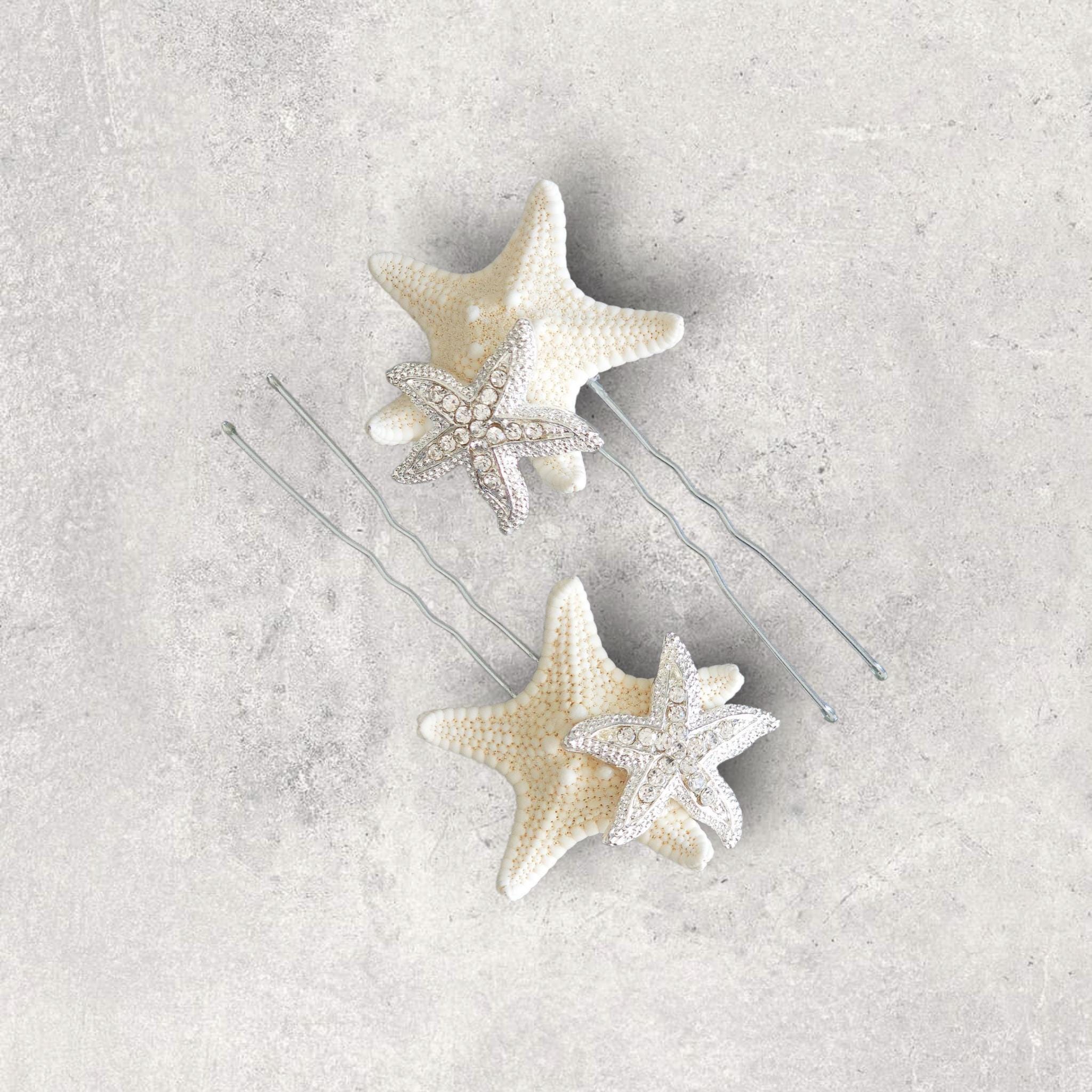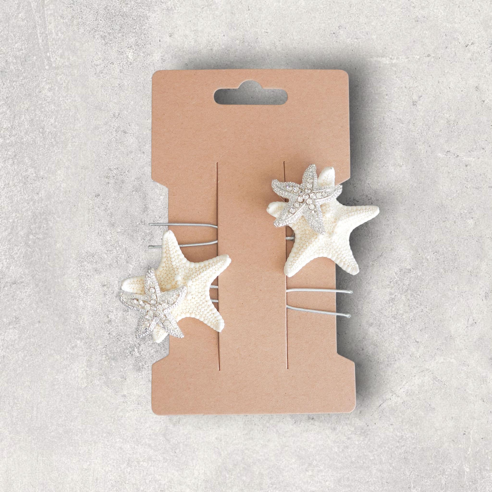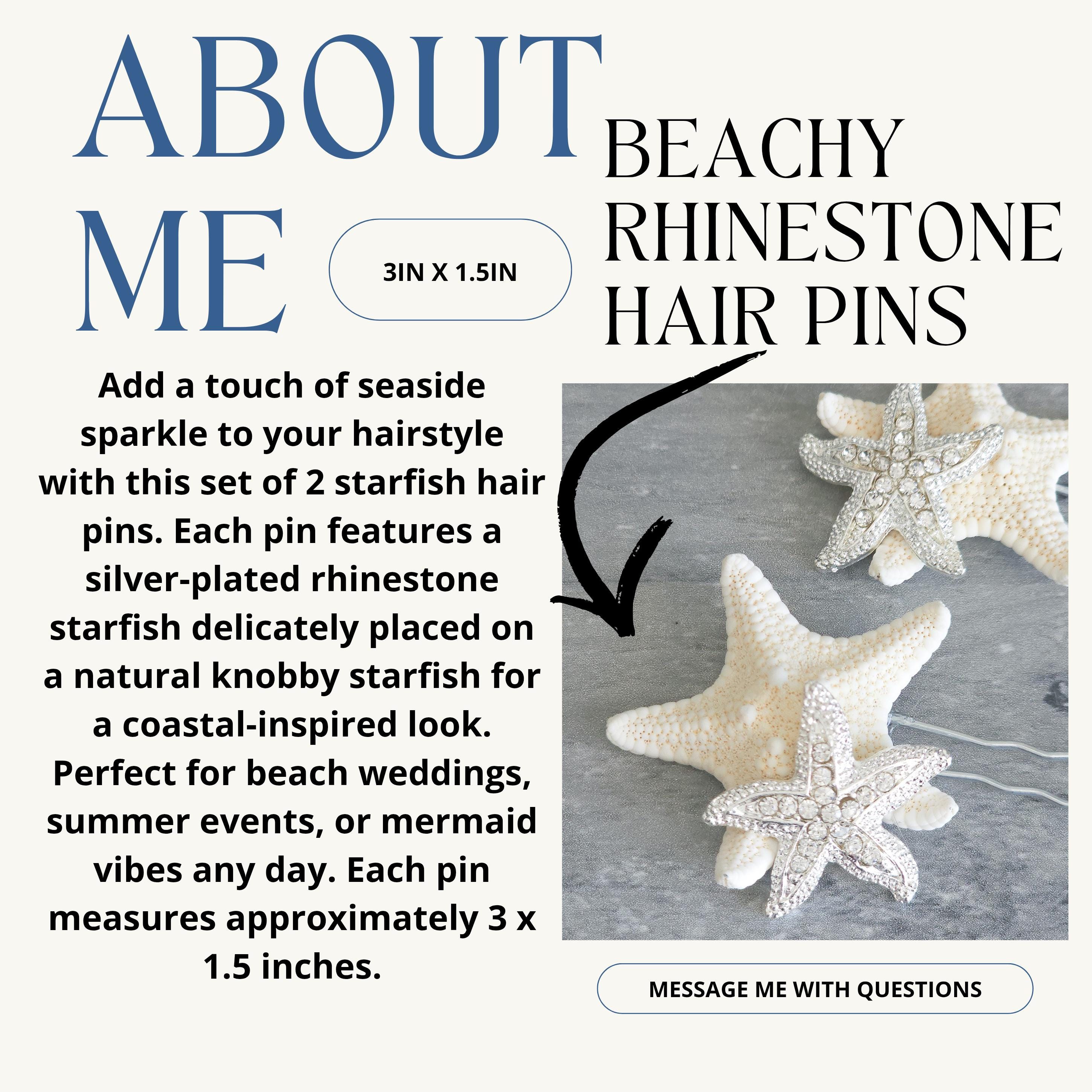 Add a touch of seaside sparkle to your hairstyle with this set of 2 starfish hair pins. Each pin features a silver-plated rhinestone starfish delicately placed on a natural knobby starfish for a coastal-inspired look. Perfect for beach weddings, summer events, or mermaid vibes any day. Each pin measures approximately 3 x 1.5 inches.