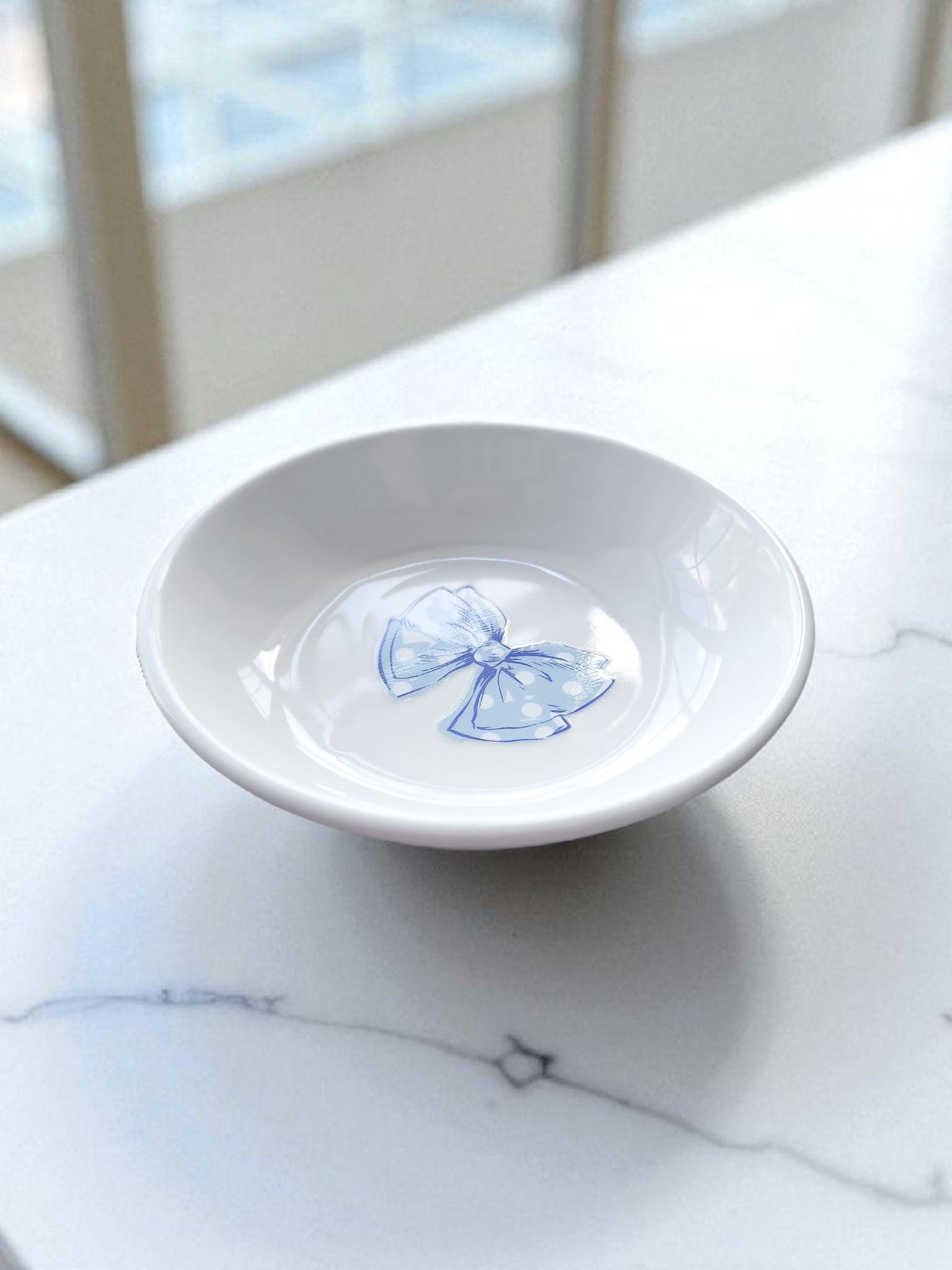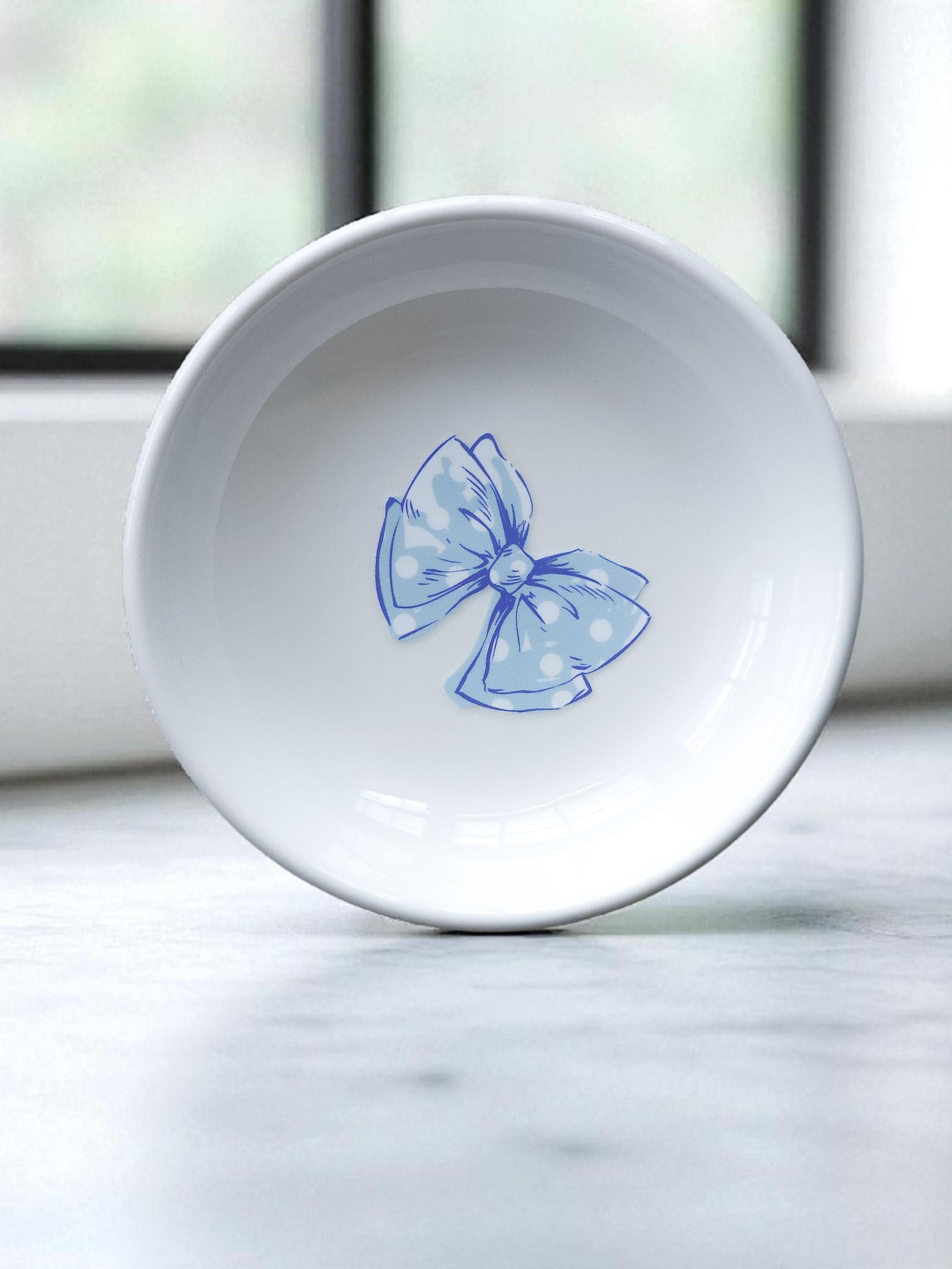 Add a splash of seaside charm to your vanity or nightstand with this handcrafted ceramic jewelry dish. Featuring a delicate blue coquette Nautical blue bow design applied using UV DTF, this 4-inch round tray is perfect for holding rings, earrings, or small treasures. The glossy white ceramic finish makes it a stylish and functional accent for any beach lover, coastal home, or nautical décor theme.